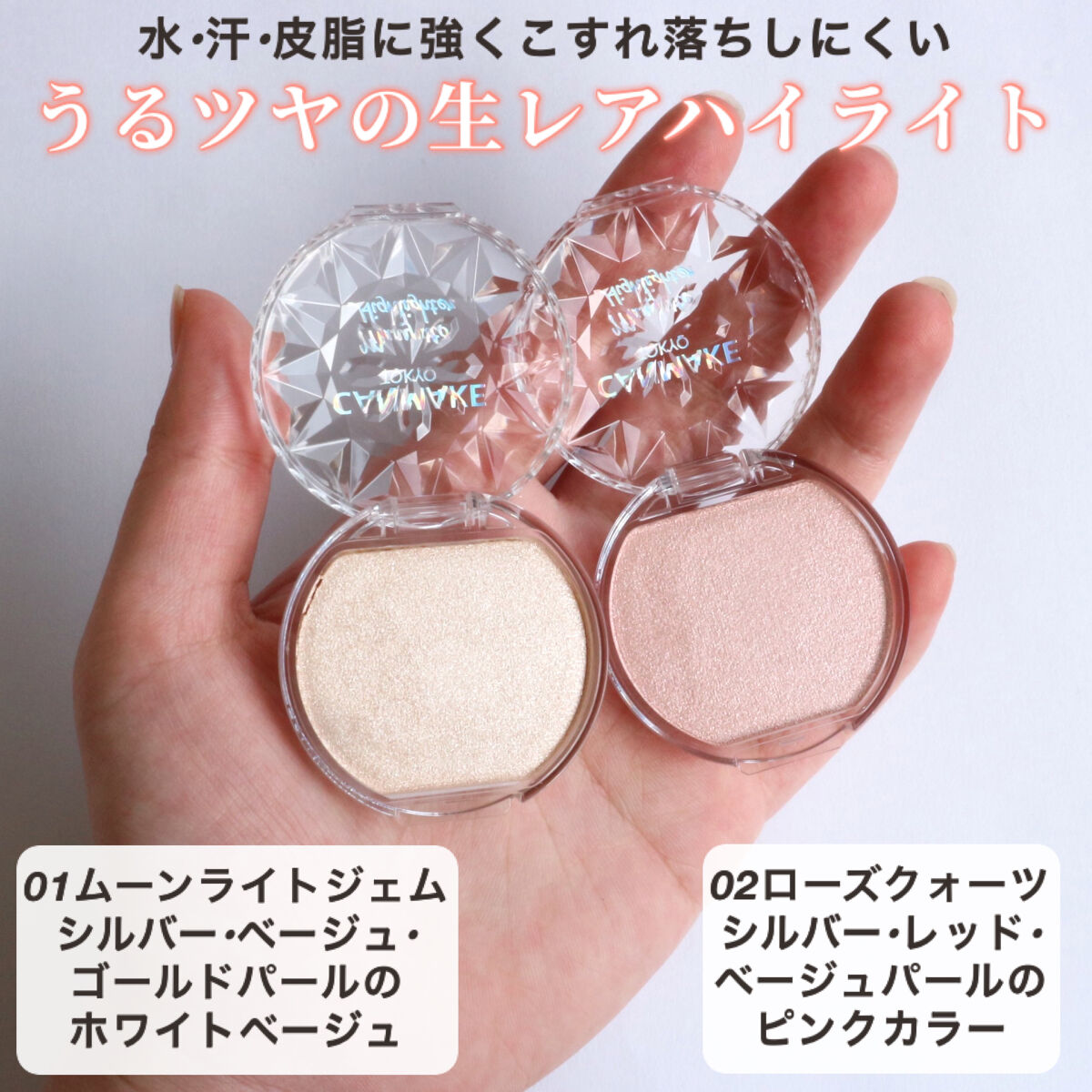 あふれ出すようなうるっとツヤで、透明感のある光沢肌に仕上がるハイライター。 むにゅっとした質感で、お肌にぴたっと密着。 これを仕込んだ上にフィニッシングパウダーを重ねると内側から輝くようにジュワッと光が放たれて艶玉が演出できます💕