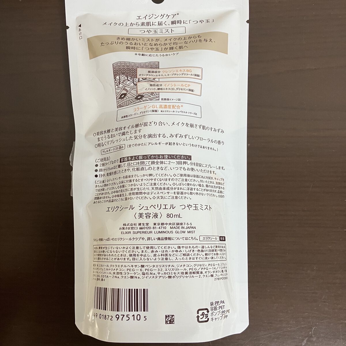 - エリクシール エイジングケア※5 メイクの上から素肌に届く。瞬時に「つや玉」。 ※5 エイジングケアとは、年齢に応じたうるおいケアです。 ○きめ細かいミストが、メイクの上からも、たっぷりのうるおいとなめらかで均一なハリを与え、瞬時に「つや玉」が輝く肌へ -厳選成分 クレソンエキスBG オランダカラシエキス、1,3-ブチレングリコール(保湿) -独自成分 イノシトールCP イノシット、酵母エキス(3)、グリセリン(保湿) -コラーゲンGL高濃度配合※6 ※6 エリクシールシュペリエル シリーズ比 水溶性コラーゲン、グリセリン(保湿) ○美容水層と美容オイル層が混ざり合い、メイクを崩さず肌のすみずみまでうるおいで満たします ○明るくリフレッシュした気分を演出する、みずみずしいフローラルの香り ○アレルギーテスト済み (全てのかたにアレルギーが起きないというわけではありません。)