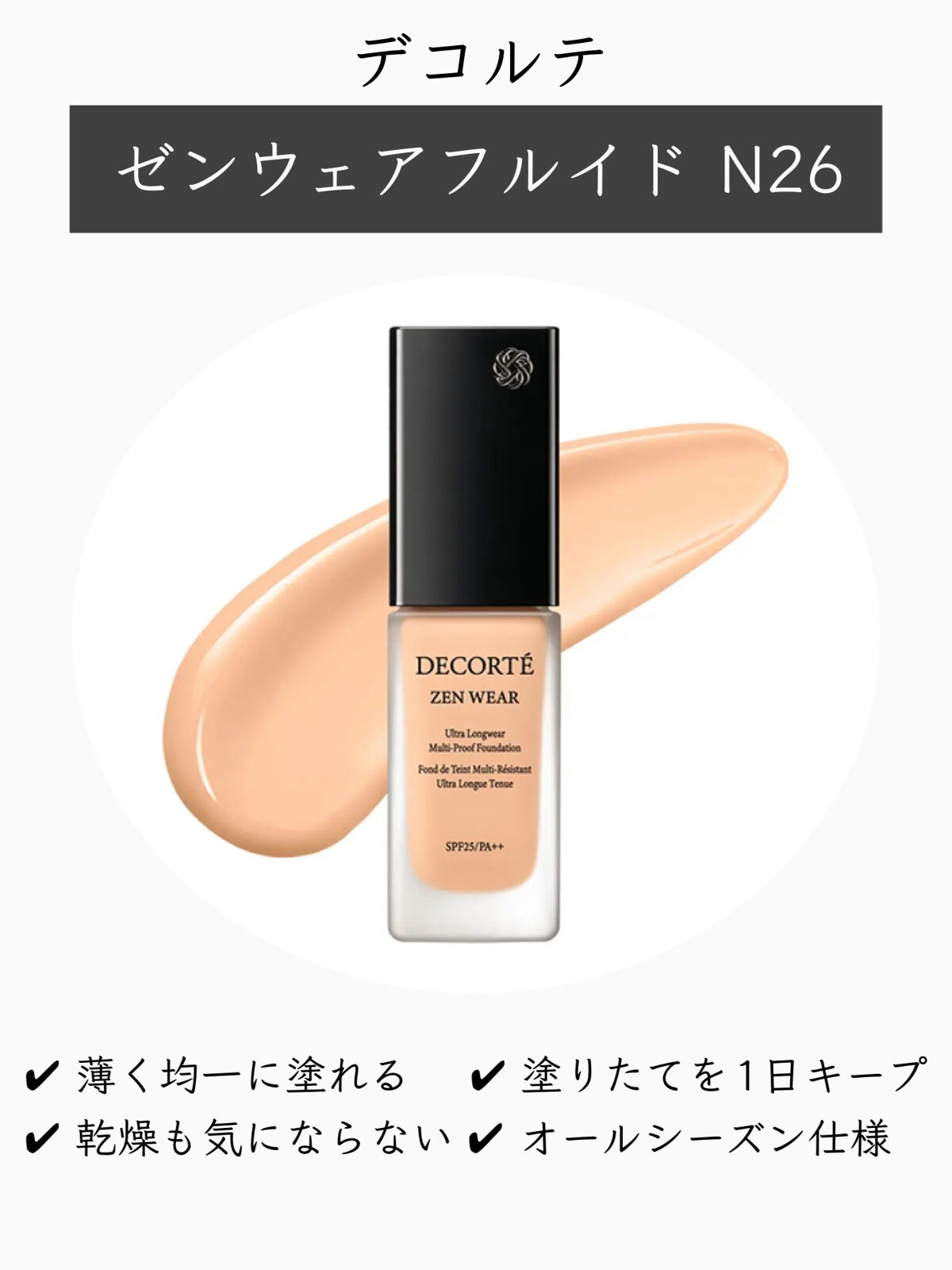 ▶︎DECORTÉゼンウェアフルイド✂テクスチャーがみずみずしくて、均等に顔全体に伸ばしやすいです!厚塗り感が出にくい仕上がりで、ほどよいカバー力もあり、肌が綺麗に見えるところもお気に入り🥰仕上がりは、セミマットでテカらない絶妙なバランス✨気...