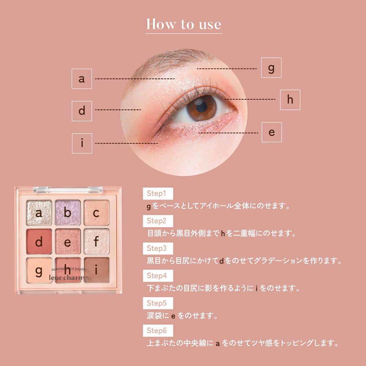 - 「ときめいて、私の瞳。」というキャッチフレーズの下、発色と質感にこだわった日本製9色アイシャドウパレット「leur charme material color palette(ルルシャルム マテリアルカラーパレット)」。2種展開で、どちらも個性的なカラーを入れつつ、絶妙な色合いやラメの使い方によって、パーソナルカラーにとらわれることなく好きな色を楽しめる構成となっています。