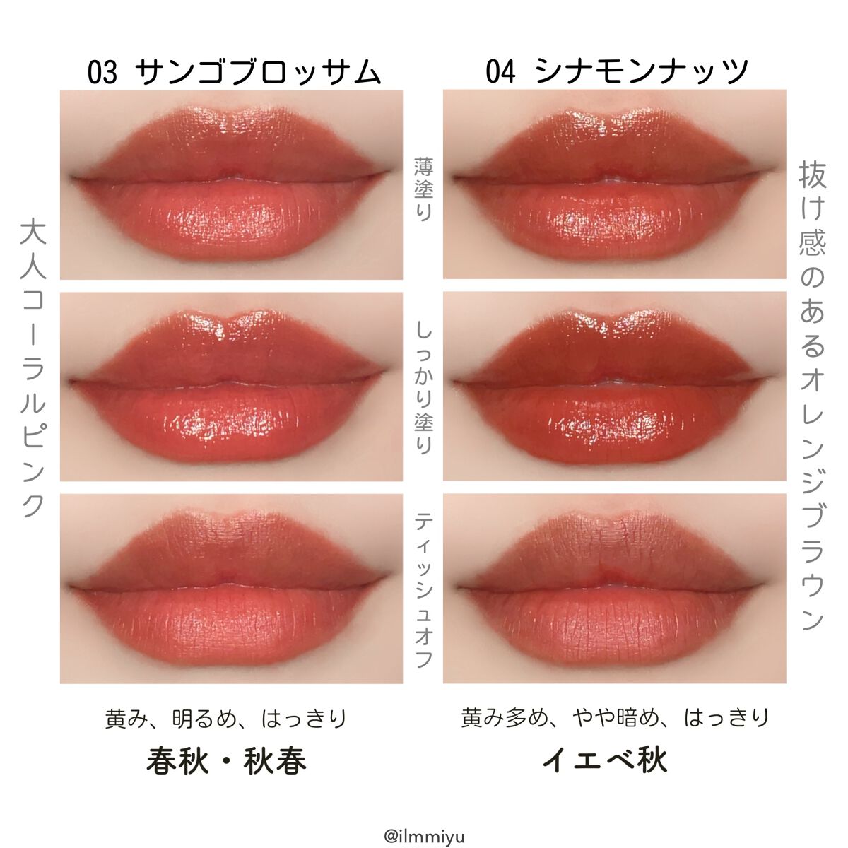 - <01 カーディナルローズ> 水、ダイマージリノール酸ダイマージリノレイル、ジフェニルジメチコン、ジフェニルシロキシフェニルトリメチコン、オクチルドデカノール、トリイソステアリン酸ポリグリセリルー2、ラウロイルグルタミン酸ジ(フィトステリル/オクチルドデシル)、ダイマージリノール酸(フィトステリル/イソステアリル/セチル/ステアリル/ベヘニル)、BG、水添ポリイソブテン、グリセリン、セテスー10、エタノール、セチルPEG/PPGー10/1ジメチコン、(アクリル酸ヒドロキシエチル/アクリロイルジメチルタウリンNa)コポリマー、イソヘキサデカン、フェノキシエタノール、メチルパラベン、ポリソルベート60、トコフェロール、エチルパラベン、デヒドロ酢酸Na、リン酸2Na、リン酸Na、シリカ、シメチコン、ハチミツ、スクワラン、ステアリン酸ソルビタン、ステアリン酸グリセリル、オレイン酸ポリグリセリルー10、セルロースガム、ヒアルロン酸Na、ローズマリー葉エキス、(+/ー)酸化鉄、酸化チタン、アクリレーツコポリマーアンモニウム、赤226、赤227、黄4、ポリアスパラギン酸Na、水酸化Al、PVP、キサンタンガム、EDTAー2Na、青1 <02 クラシカルプラム> 水、ダイマージリノール酸ダイマージリノレイル、ジフェニルジメチコン、ジフェニルシロキシフェニルトリメチコン、オクチルドデカノール、トリイソステアリン酸ポリグリセリルー2、ラウロイルグルタミン酸ジ(フィトステリル/オクチルドデシル)、ダイマージリノール酸(フィトステリル/イソステアリル/セチル/ステアリル/ベヘニル)、BG、水添ポリイソブテン、グリセリン、セテスー10、エタノール、セチルPEG/PPGー10/1ジメチコン、(アクリル酸ヒドロキシエチル/アクリロイルジメチルタウリンNa)コポリマー、イソヘキサデカン、フェノキシエタノール、メチルパラベン、ポリソルベート60、トコフェロール、エチルパラベン、デヒドロ酢酸Na、リン酸2Na、リン酸Na、シリカ、シメチコン、ハチミツ、スクワラン、ステアリン酸ソルビタン、ステアリン酸グリセリル、オレイン酸ポリグリセリルー10、セルロースガム、ヒアルロン酸Na、ローズマリー葉エキス、(+/ー)酸化鉄、酸化チタン、アクリレーツコポリマーアンモニウム、赤226、赤227、黄4、ポリアスパラギン酸Na、水酸化Al、PVP、キサンタンガム、EDTAー2Na、青1 <03 サンゴブロッサム> 水、ダイマージリノール酸ダイマージリノレイル、ジフェニルジメチコン、ジフェニルシロキシフェニルトリメチコン、オクチルドデカノール、トリイソステアリン酸ポリグリセリルー2、ラウロイルグルタミン酸ジ(フィトステリル/オクチルドデシル)、ダイマージリノール酸(フィトステリル/イソステアリル/セチル/ステアリル/ベヘニル)、BG、水添ポリイソブテン、グリセリン、セテスー10、エタノール、セチルPEG/PPGー10/1ジメチコン、(アクリル酸ヒドロキシエチル/アクリロイルジメチルタウリンNa)コポリマー、イソヘキサデカン、フェノキシエタノール、メチルパラベン、ポリソルベート60、トコフェロール、エチルパラベン、デヒドロ酢酸Na、リン酸2Na、リン酸Na、シリカ、シメチコン、ハチミツ、スクワラン、ステアリン酸ソルビタン、ステアリン酸グリセリル、オレイン酸ポリグリセリルー10、セルロースガム、ヒアルロン酸Na、ローズマリー葉エキス、(+/ー)酸化鉄、酸化チタン、アクリレーツコポリマーアンモニウム、赤226、赤227、黄4、ポリアスパラギン酸Na、水酸化Al、PVP、キサンタンガム、EDTAー2Na、青1 <04 シナモンナッツ> 水、ダイマージリノール酸ダイマージリノレイル、ジフェニルジメチコン、ジフェニルシロキシフェニルトリメチコン、オクチルドデカノール、トリイソステアリン酸ポリグリセリルー2、ラウロイルグルタミン酸ジ(フィトステリル/オクチルドデシル)、ダイマージリノール酸(フィトステリル/イソステアリル/セチル/ステアリル/ベヘニル)、BG、水添ポリイソブテン、グリセリン、セテスー10、エタノール、セチルPEG/PPGー10/1ジメチコン、(アクリル酸ヒドロキシエチル/アクリロイルジメチルタウリンNa)コポリマー、イソヘキサデカン、フェノキシエタノール、メチルパラベン、ポリソルベート60、トコフェロール、エチルパラベン、デヒドロ酢酸Na、リン酸2Na、リン酸Na、シリカ、シメチコン、ハチミツ、スクワラン、ステアリン酸ソルビタン、ステアリン酸グリセリル、オレイン酸ポリグリセリルー10、セルロースガム、ヒアルロン酸Na、ローズマリー葉エキス、(+/ー)酸化鉄、酸化チタン、アクリレーツコポリマーアンモニウム、赤226、赤227、黄4、ポリアスパラギン酸Na、水酸化Al、PVP、キサンタンガム、EDTAー2Na、青1 <05 カヌレブラウン> 水、ダイマージリノール酸ダイマージリノレイル、ジフェニルジメチコン、ジフェニルシロキシフェニルトリメチコン、オクチルドデカノール、トリイソステアリン酸ポリグリセリルー2、ラウロイルグルタミン酸ジ(フィトステリル/オクチルドデシル)、ダイマージリノール酸(フ