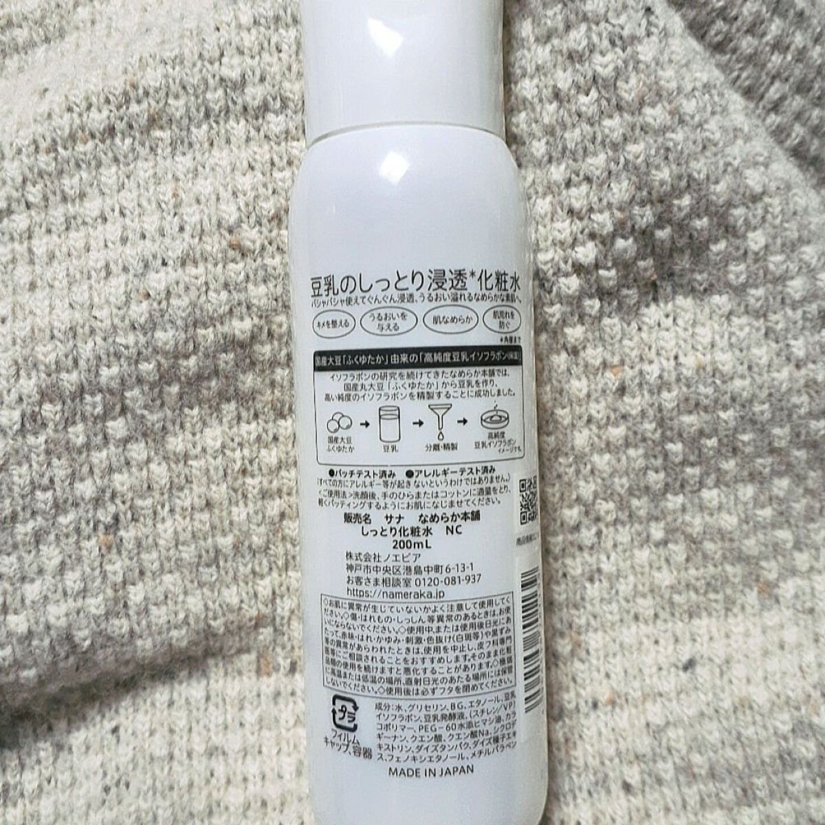 - <200ml> 水、グリセリン、BG、エタノール、エチルヘキサン酸セチル、豆乳イソフラボン、豆乳発酵液、(アクリル酸ヒドロキシエチル/アクリロイルジメチルタウリンNa)コポリマー、PEG-40水添ヒマシ油、アルギニン、カルボマー、シクロデキストリン、スクワラン、セルロースガム、ダイズタンパク、ダイズ種子エキス、ネオペンタン酸イソステアリル、ポリソルベート60、ラウロイルグルタミン酸ジ(オクチルドデシル/フィトステリル/ベヘニル)、フェノキシエタノール、メチルパラベン <つめかえ用180ml> 水、グリセリン、BG、エタノール、エチルヘキサン酸セチル、豆乳イソフラボン、豆乳発酵液、(アクリル酸ヒドロキシエチル/アクリロイルジメチルタウリンNa)コポリマー、PEG-40水添ヒマシ油、アルギニン、カルボマー、シクロデキストリン、スクワラン、セルロースガム、ダイズタンパク、ダイズ種子エキス、ネオペンタン酸イソステアリル、ポリソルベート60、ラウロイルグルタミン酸ジ(オクチルドデシル/フィトステリル/ベヘニル)、フェノキシエタノール、メチルパラベン