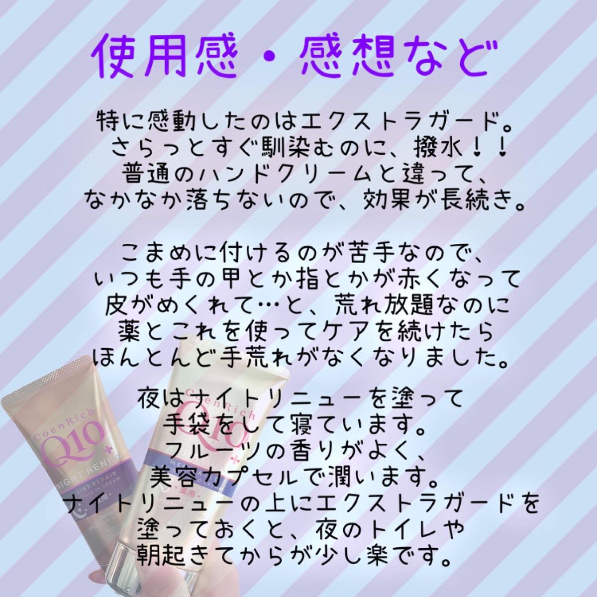 特にエクストラガードですが、ハンドクリームなのに医薬部外品!高撥水!落ちない! すごいです。 こまめにハンドクリームをつけるのが苦手なのですが、これなら一度つけたら長持ちしてくれるので安心です。 年中手荒れがひどいのですが、薬とこれの併用で、手荒れがほぼ治りました。 保湿って大事だ… ナイトリニューは香りが良い◎ フルーツの香りで、保湿力も高いです。 ナイトリニュー塗った後にエクストラガード塗って、手袋して寝てます。 エクストラガード 448円 ナイトリニュー462円 でした。 他のコエンリッチシリーズと変わらないので、ぜひハンドクリーム難民の方、使ってみてください!