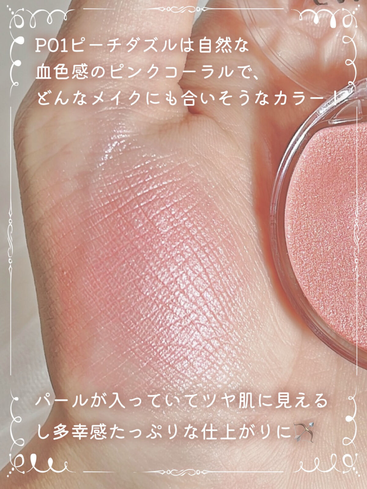 - <P01 ピーチダズル> トリエチルヘキサノイン、ジメチコン、シリカ、(ジメチコン/ビニルジメチコン)クロスポリマー、合成フルオロフロゴパイト、スクワラン、オリーブ果実油、ホホバ種子油、カニナバラ果実油、マイクロクリスタリンワックス、パラフィン、フェノキシエタノール、トコフェロール、ジパルミチン酸アスコルビル、リンゴ酸ジイソステアリル、タルク、マイカ、酸化チタン、酸化鉄、赤226、赤202、水酸化Al、酸化スズ <P05 ペールライラック> トリエチルヘキサノイン、ジメチコン、合成フルオロフロゴパイト、シリカ、(ジメチコン/ビニルジメチコン)クロスポリマー、スクワラン、オリーブ果実油、ホホバ種子油、カニナバラ果実油、マイクロクリスタリンワックス、パラフィン、フェノキシエタノール、トコフェロール、ジパルミチン酸アスコルビル、リンゴ酸ジイソステアリル、マイカ、酸化チタン、酸化鉄、赤226、赤202、コンジョウ、水酸化Al、酸化スズ <P02 ローズペタル> トリエチルヘキサノイン、ジメチコン、シリカ、(ジメチコン/ビニルジメチコン)クロスポリマー、合成フルオロフロゴパイト、スクワラン、オリーブ果実油、ホホバ種子油、カニナバラ果実油、マイクロクリスタリンワックス、パラフィン、フェノキシエタノール、トコフェロール、ジパルミチン酸アスコルビル、リンゴ酸ジイソステアリル、タルク、マイカ、酸化チタン、酸化鉄、赤202、赤226、コンジョウ、水酸化Al、酸化スズ