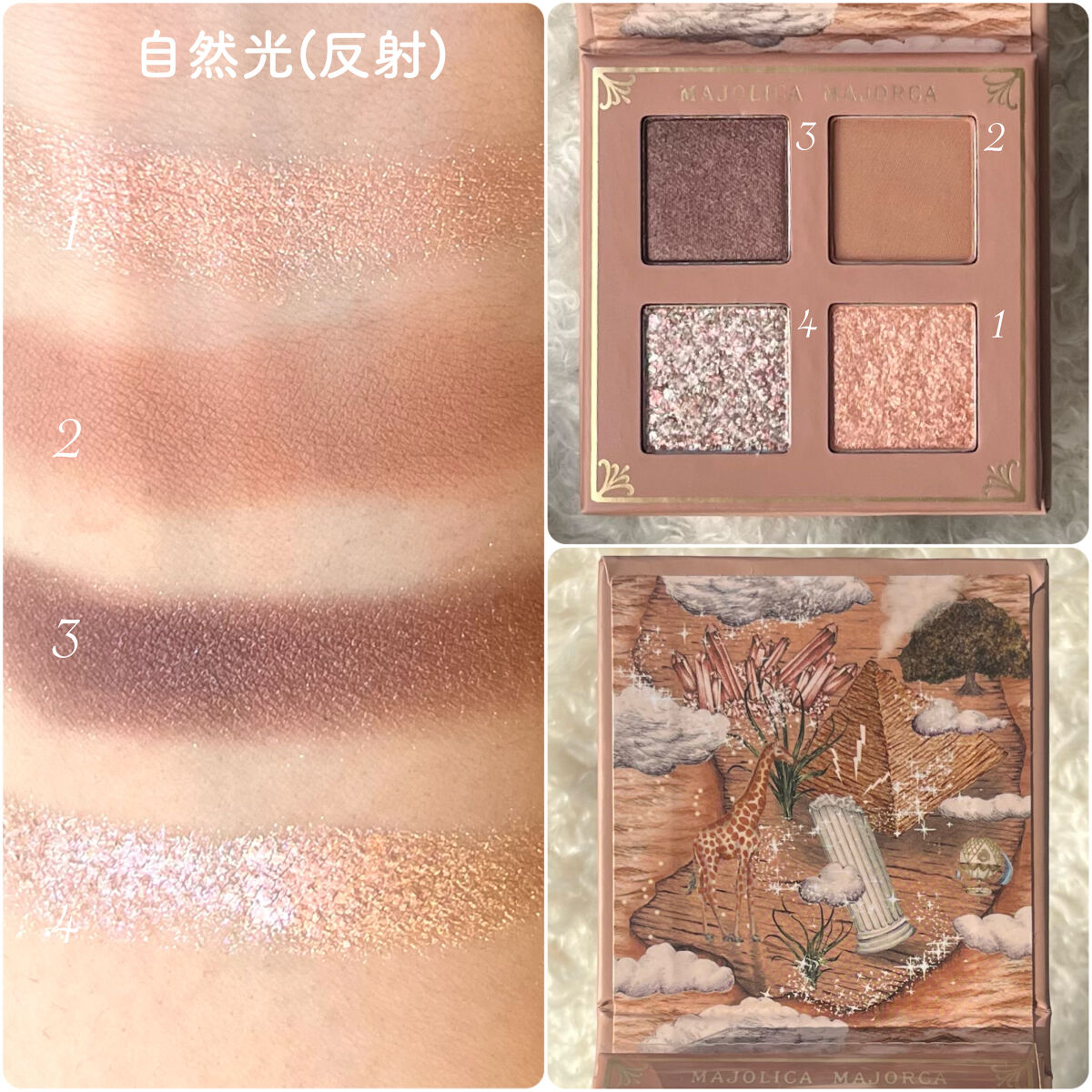 - マット・パール・ラメ・グリッターと質感の異なる 4 色のアイシャドウパレット「シャドーフラッシュ」は、4 種の質感を重ね合わせることで溶け込むような極上グラデが叶い、大きな瞳の仕上がりに。パレットの左下にある“フラッ シュグリッターカラー”は、まばゆくようなさまざまな輝きがつまったカラーで、まぶたの上や、涙袋など、塗り方 次第で異なった印象を楽しむことができます。 さらに、アイシャドウパレットには、それぞれのパレット名のイメージモチーフがあしらわれたマジョリカマジョルカの魔法の世界の地図が描かれており、3 種のアイシャドウパレットを並べることで、1 枚の地図のイラストが 完成します。メイクをしながら夢の国を旅するような気分を味わうことができ、アイメイクがさらに楽しくなるような 魔法の世界へと誘います。
