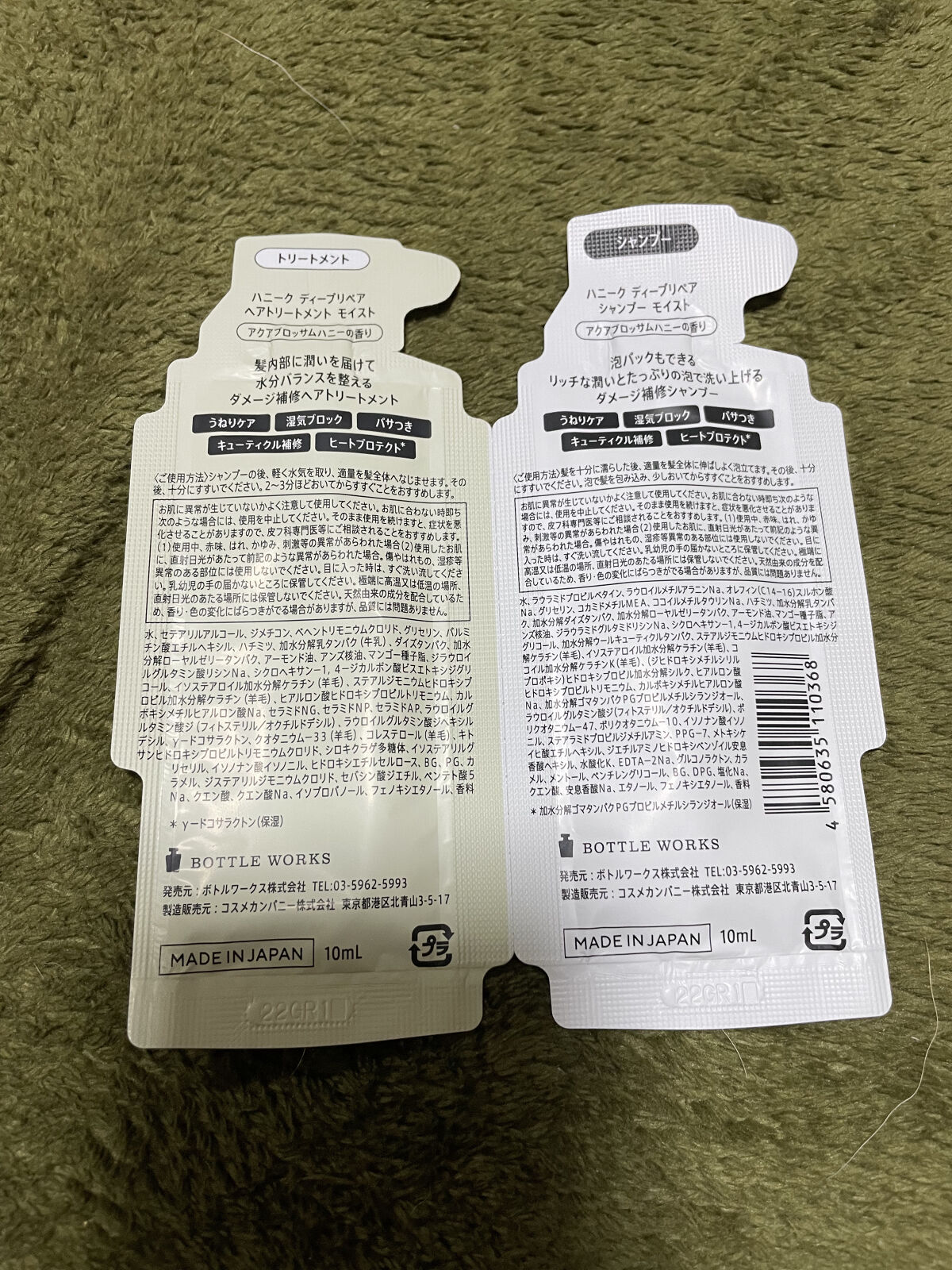 - <シャンプー本体 450ml> 水、ラウロイルメチルアラニンNa、ラウラミドプロピルベタイン、コカミドメチルMEA、グリセリン、ココイルメチルタウリンNa、ハチミツ、加水分解乳タンパク、加水分解ダイズタンパク、加水分解ローヤルゼリータンパク、アーモンド油、マンゴー種子脂、アンズ核油、ジラウラミドグルタミドリシンNa、シクロヘキサン-1,4-ジカルボン酸ビスエトキシジグリコール、加水分解ウールキューティクルタンパク、ステアルジモニウムヒドロキシプロピル加水分解ケラチン(羊毛)、イソステアロイル加水分解ケラチン(羊毛)、ココイル加水分解ケラチンK(羊毛)、(ジヒドロキシメチルシリルプロポキシ)ヒドロキシプロピル加水分解シルク、ヒアルロン酸ヒドロキシプロピルトリモニウム、カルボキシメチルヒアルロン酸Na、加水分解ゴマタンパクPGプロピルメチルシランジオール、ラウロイルグルタミン酸ジ(フィトステリル/オクチルドデシル)、ポリクオタニウム-47、ポリクオタニウム-10、イソノナン酸イソノニル、ステアラミドプロピルジメチルアミン、PPG-7、メトキシケイヒ酸エチルヘキシル、ジエチルアミノヒドロキシベンゾイル安息香酸ヘキシル、水酸化K、EDTA-2Na、グルコノラクトン、カラメル、メントール、ペンチレングリコール、BG、DPG、塩化Na、クエン酸、安息香酸Na、エタノール、フェノキシエタノール、香料 <トリートメント本体 450ml> 水、セテアリルアルコール、ジメチコン、ベヘントリモニウムクロリド、グリセリン、パルミチン酸エチルヘキシル、ハチミツ、加水分解乳タンパク(牛乳)、ダイズタンパク、加水分解ローヤルゼリータンパク、アーモンド油、アンズ核油、マンゴー種子脂、ジラウロイルグルタミン酸リシンNa、シクロヘキサン-1,4-ジカルボン酸ビスエトキシジグリコール、イソステアロイル加水分解ケラチン(羊毛)、ステアルジモニウムヒドロキシプロピル加水分解ケラチン(羊毛)、ヒアルロン酸ヒドロキシプロピルトリモニウム、カルボキシメチルヒアルロン酸Na、セラミドNG、セラミドNP、セラミドAP、ラウロイルグルタミン酸ジ(フィトステリル/オクチルドデシル)、ラウロイルグルタミン酸ジヘキシルデシル、γ-ドコサラクトン、クオタニウム-33(羊毛)、コレステロール(羊毛)、キトサンヒドロキシプロピルトリモニウムクロリド、シロキクラゲ多糖体、イソステアリルグリセリル、イソノナン酸イソノニル、ヒドロキシエチルセルロース、BG、PG、カラメル、ジステアリルジモニウムクロリド、セバシン酸ジエチル、ペンテト酸5Na、クエン酸、クエン酸Na、イソプロパノール、フェノキシエタノール、香料 <シャンプー詰替用 400ml> 水、ラウロイルメチルアラニンNa、ラウラミドプロピルベタイン、コカミドメチルMEA、グリセリン、ココイルメチルタウリンNa、ハチミツ、加水分解乳タンパク、加水分解ダイズタンパク、加水分解ローヤルゼリータンパク、アーモンド油、マンゴー種子脂、アンズ核油、ジラウラミドグルタミドリシンNa、シクロヘキサン-1,4-ジカルボン酸ビスエトキシジグリコール、加水分解ウールキューティクルタンパク、ステアルジモニウムヒドロキシプロピル加水分解ケラチン(羊毛)、イソステアロイル加水分解ケラチン(羊毛)、ココイル加水分解ケラチンK(羊毛)、(ジヒドロキシメチルシリルプロポキシ)ヒドロキシプロピル加水分解シルク、ヒアルロン酸ヒドロキシプロピルトリモニウム、カルボキシメチルヒアルロン酸Na、加水分解ゴマタンパクPGプロピルメチルシランジオール、ラウロイルグルタミン酸ジ(フィトステリル/オクチルドデシル)、ポリクオタニウム-47、ポリクオタニウム-10、イソノナン酸イソノニル、ステアラミドプロピルジメチルアミン、PPG-7、メトキシケイヒ酸エチルヘキシル、ジエチルアミノヒドロキシベンゾイル安息香酸ヘキシル、水酸化K、EDTA-2Na、グルコノラクトン、カラメル、メントール、ペンチレングリコール、BG、DPG、塩化Na、クエン酸、安息香酸Na、エタノール、フェノキシエタノール、香料 <トリートメント詰替用 400ml> 水、セテアリルアルコール、ジメチコン、ベヘントリモニウムクロリド、グリセリン、パルミチン酸エチルヘキシル、ハチミツ、加水分解乳タンパク(牛乳)、ダイズタンパク、加水分解ローヤルゼリータンパク、アーモンド油、アンズ核油、マンゴー種子脂、ジラウロイルグルタミン酸リシンNa、シクロヘキサン-1,4-ジカルボン酸ビスエトキシジグリコール、イソステアロイル加水分解ケラチン(羊毛)、ステアルジモニウムヒドロキシプロピル加水分解ケラチン(羊毛)、ヒアルロン酸ヒドロキシプロピルトリモニウム、カルボキシメチルヒアルロン酸Na、セラミドNG、セラミドNP、セラミドAP、ラウロイルグルタミン酸ジ(フィトステリル/オクチルドデシル)、ラウロイルグルタミン酸ジヘキシルデシル、γ-ドコサラクトン、クオタニウム-33(羊毛)、コレステロール(羊毛)、キトサンヒドロキシプロピルトリモニウムクロリド、シ