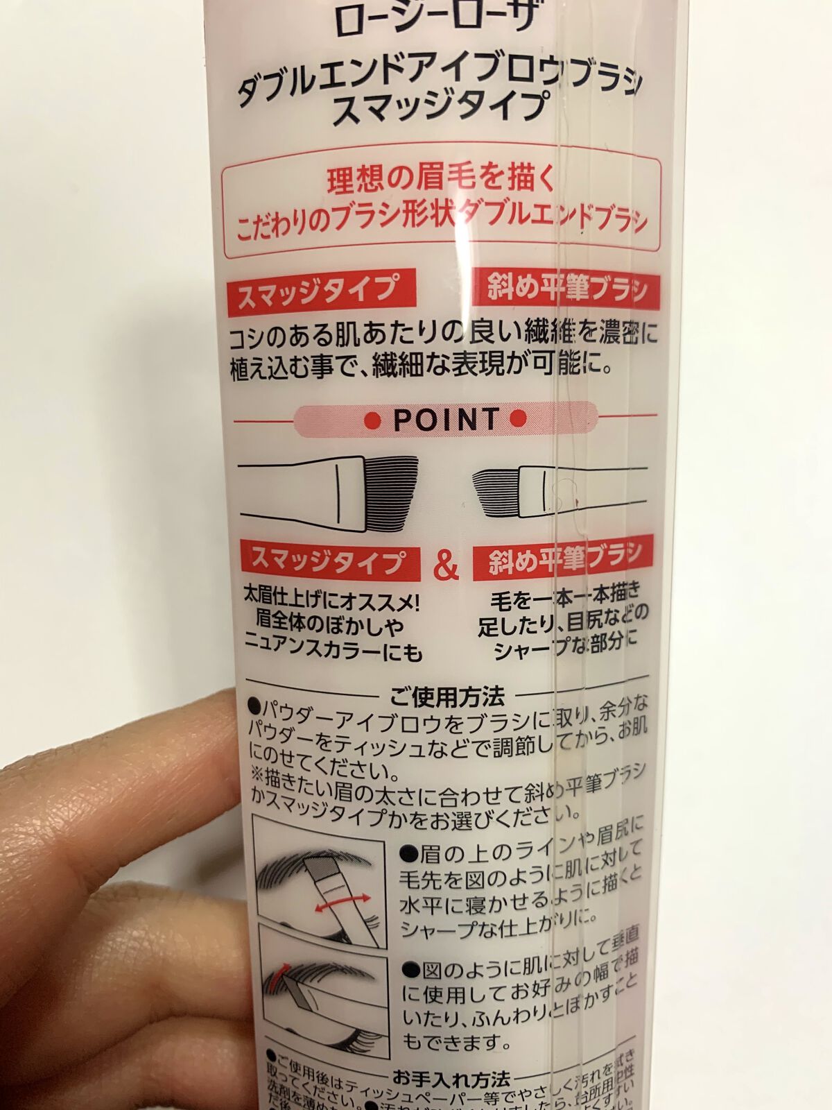 - 理想の眉毛を描くこだわりのブラシ形状ダブルエンドアイブロウブラシ。 スマッジタイプ:太眉仕上げにオススメ!眉全体のぼかしやニュアンスカラーにも。 斜め平筆ブラシ:毛を一本一本描き足したり、目尻などのシャープな部分に。