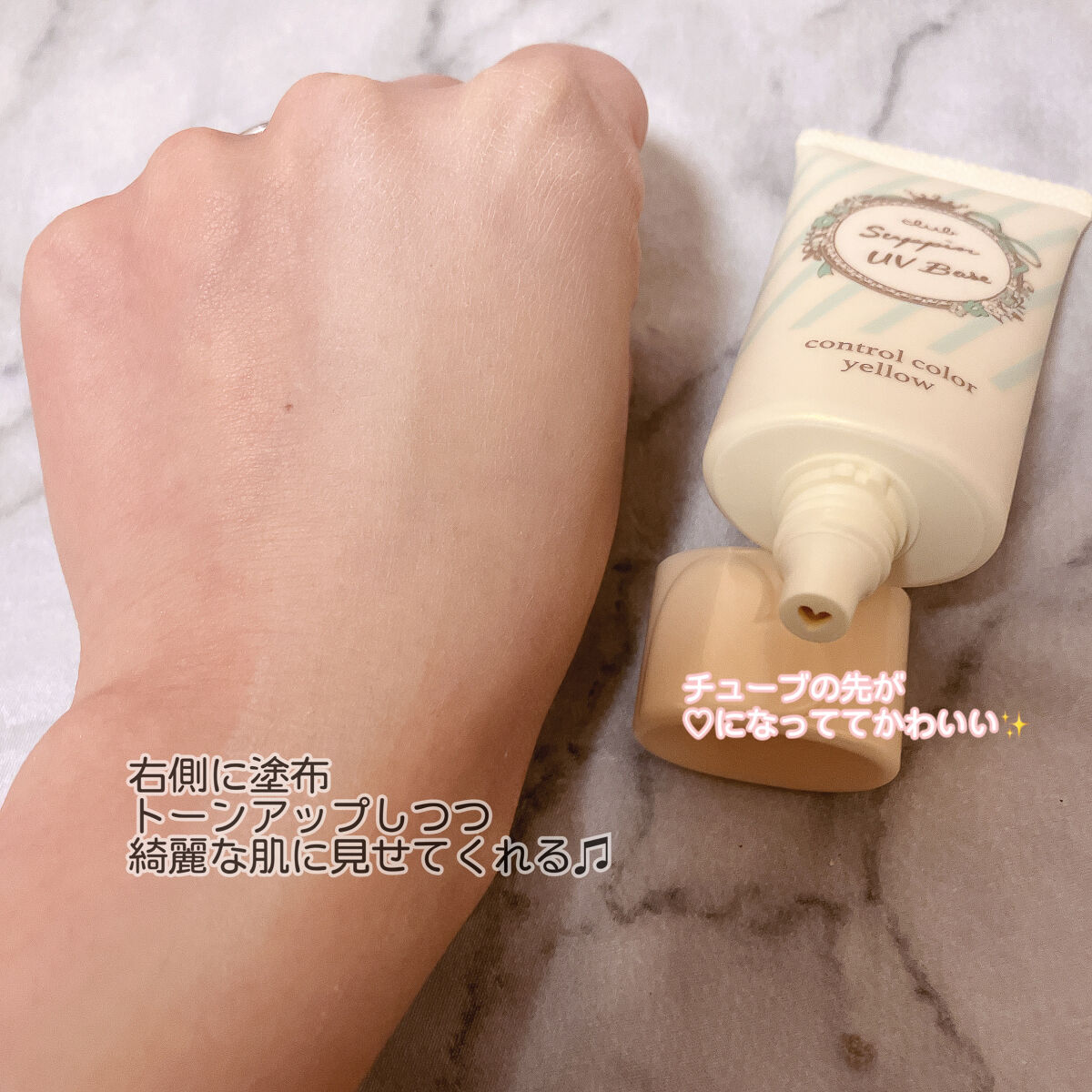 スキンケア発想の肌にやさしいUV機能付きの化粧下地になっております✨ チューブの口もとがハートになっているので、ハート型にでてきます。 パステルローズの甘い香りがします。