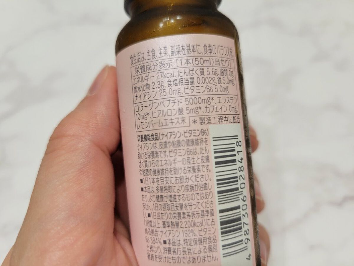 - コラーゲンペプチド(ゼラチンを含む)(国内製造)、還元麦芽糖水飴、ぶどう果汁、エリスリトール、還元水飴、エラスチンペプチド、レモンバームエキス末、ベニバナエキス 添加物:酸味料、香料、安定剤(ペクチン)、クエン酸鉄アンモニウム、ナイアシン、甘味料(アセスルファムK、スクラロース)、V.B6、ヒアルロン酸