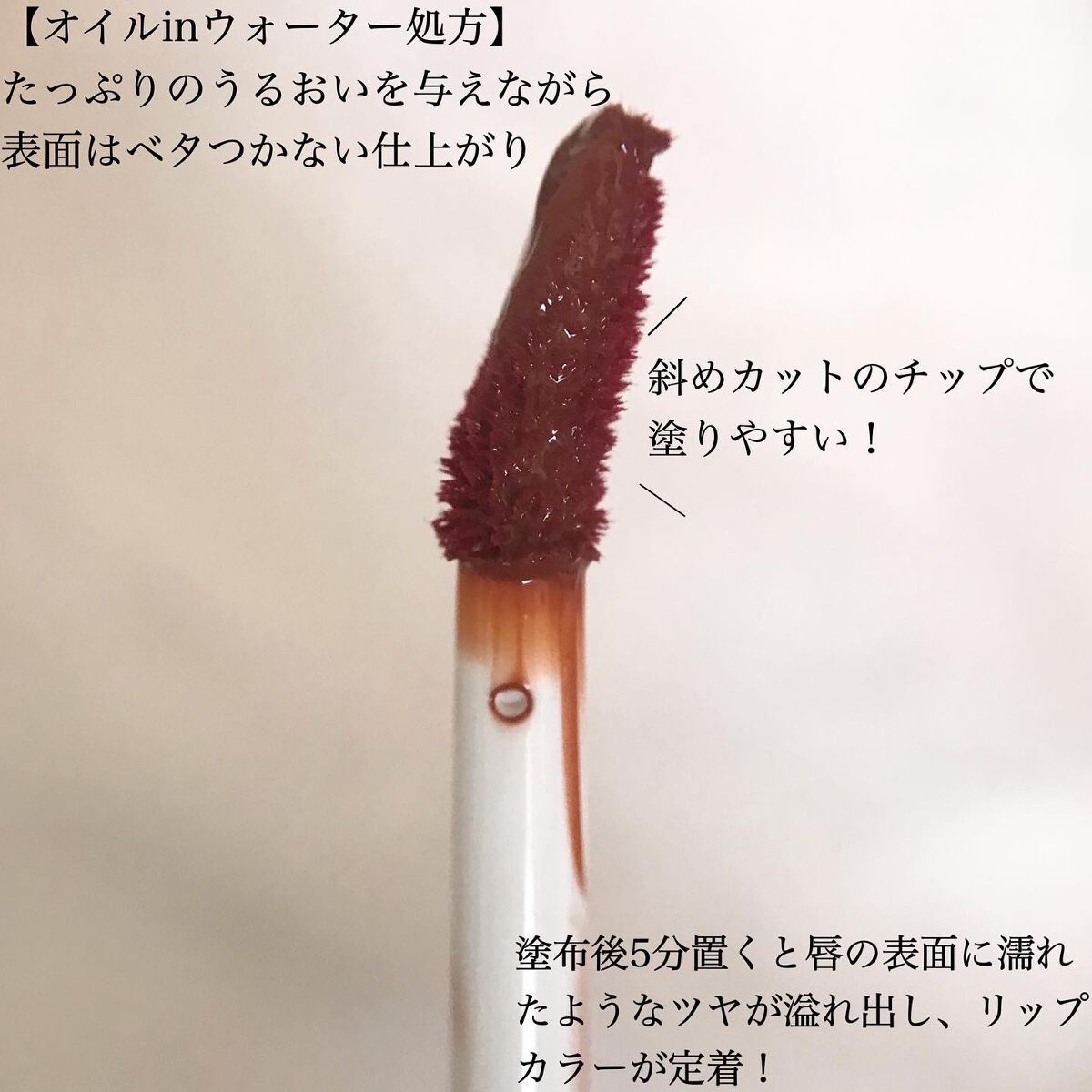 - 動物由来成分を一切使用せず、ヴィーガン100%の成分で唇への配慮と発色の良さを両立したこだわりのティントリップです。 唇にツヤ膜を形成*する「オイルinウォーター処方」で、たっぷりのうるおいを与えながら、表面はべたつかない、“ツヤ×うるおい×落ちにくい” 仕上がりを実現。屈折率の高い光沢オイルを採用し、みずみずしいツヤを最大限に引き出します。抜け感のあるニュアンスカラーが唇に溶け込むように馴染み、マスクを外しても色っぽい“うるツヤ血色感”が持続します。 *メイクアップ効果による