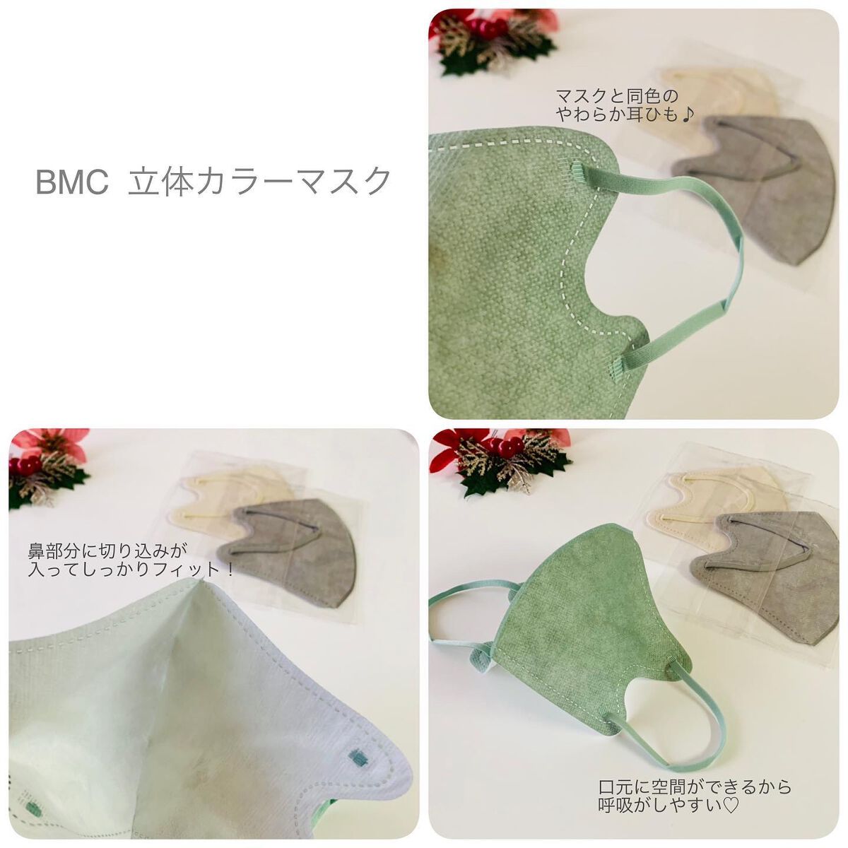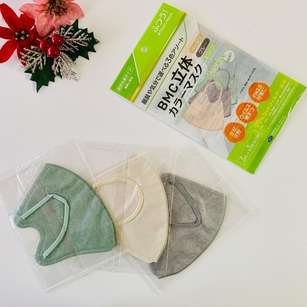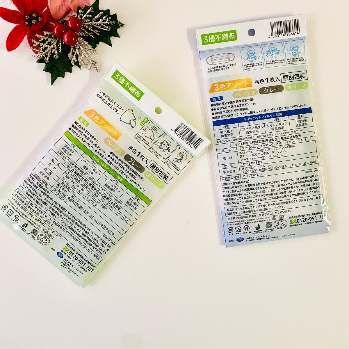 3色アソートのカラーバリエーションは、 ベージュ、グレー、オリーブです。 カラーマスクは裏面が白になっているので、表裏を間違えずに使用できる点が嬉しいです。 どちらも蒸れにくく、やわらかい耳ひもで、着け心地も快適でした。 まだまだ続くマスク生活、色味を変えてマスクもファッションとして楽しみたいですね!