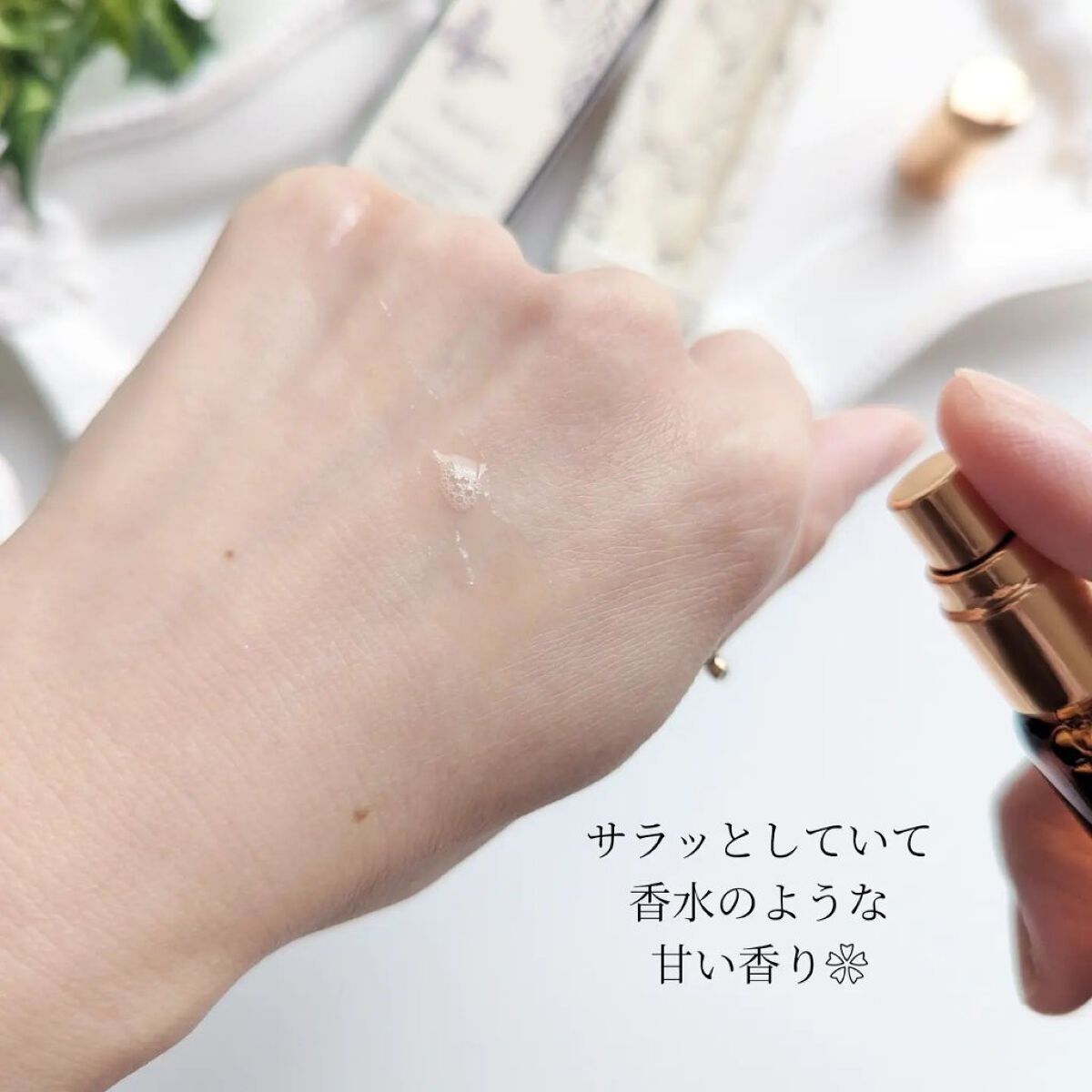 フレンチローズオイル(カニナバラ花エキス:保湿成分)が髪に潤いとツヤを与えて、魅惑的なローズフレグランスの香りで包み込んでフェミニンな印象にしてくれます🥀✨ 髪に伸ばすとパサパサに乾燥して広がってた髪が毛先までしっとりと潤い、ツヤが出ました☺️ プッシュ部分を回すだけでロックができるので蓋をする手間がないし、持ち運びのときにも安心です◎