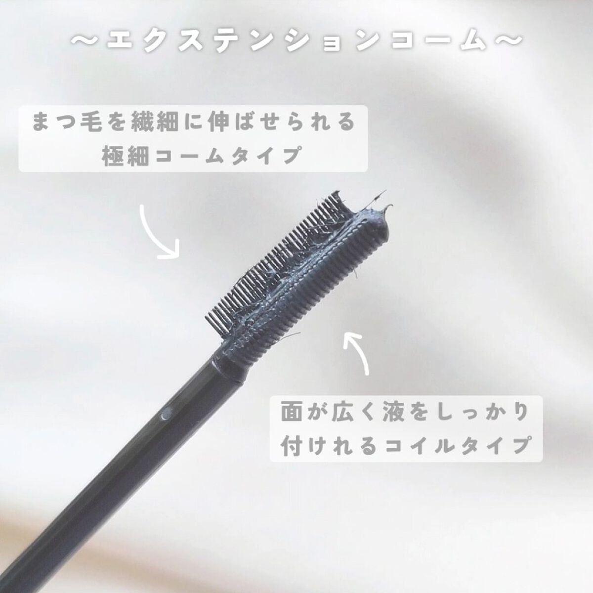 このマスカラでまず始めに推したい部分は、"ひとみ大優勝パール"が配合されているということです。 カメラ越しだと分かりづらいですが、青のパールがさりげなくチラチラと光ってくれて本当に可愛いんです…。 個人的にラメやパールが入ったマスカラは今まで挑戦しづらかったのですが、このくらいのパールなら抵抗感なく使えます…!ありがたい🤦🏻♀️ エテュセさんこだわりのコーム! 特に極細コームが凄く塗りやすい…!!本当にダマにならない! 気分によって使い分けたり2つのコームを使って重ね塗りをしたり、1つのマスカラでニュアンスを変えられるのはお値段以上だな〜〜!と思います。 性別やシーンを問わず使いやすいのにしっかり盛れる、今までありそうで無かったマスカラ。