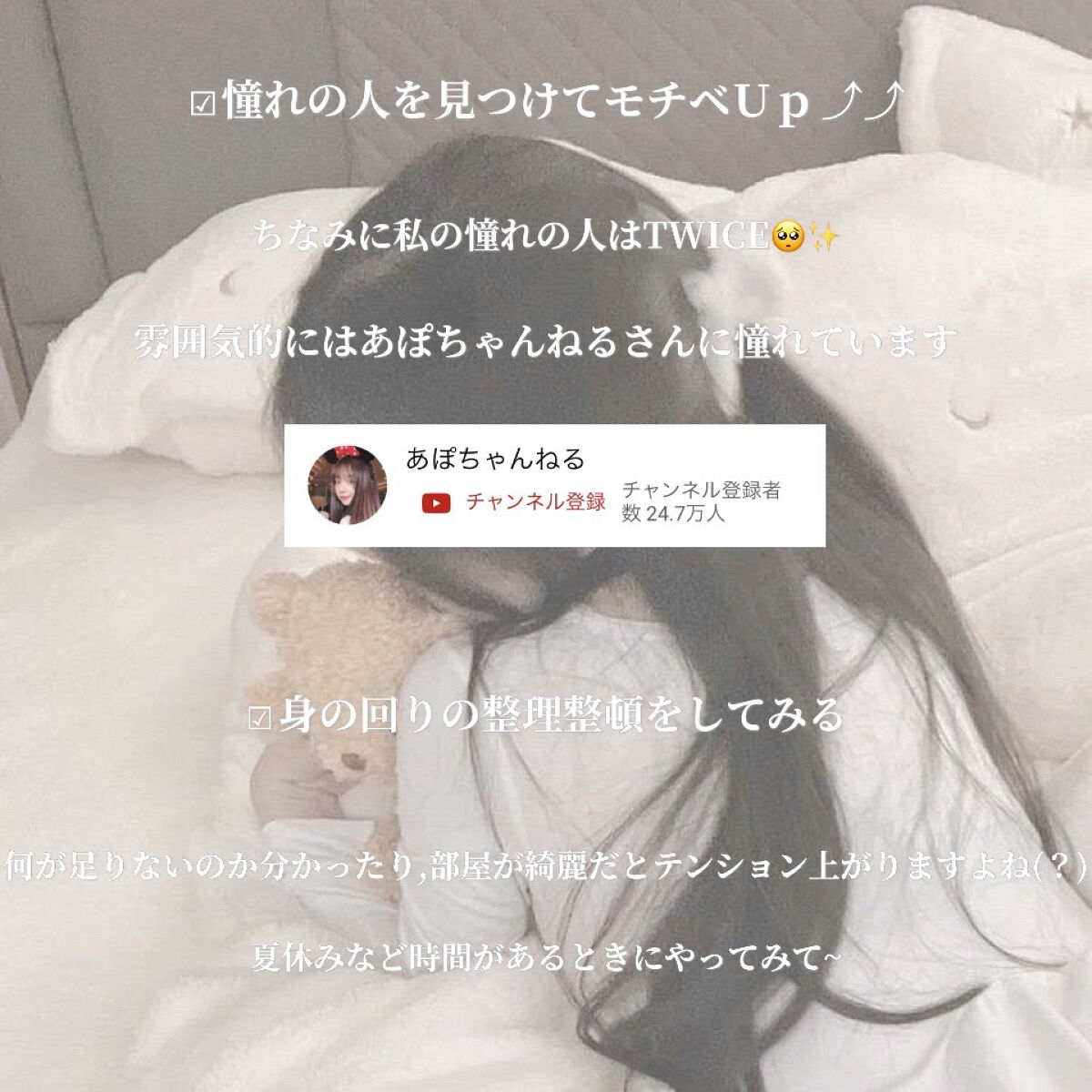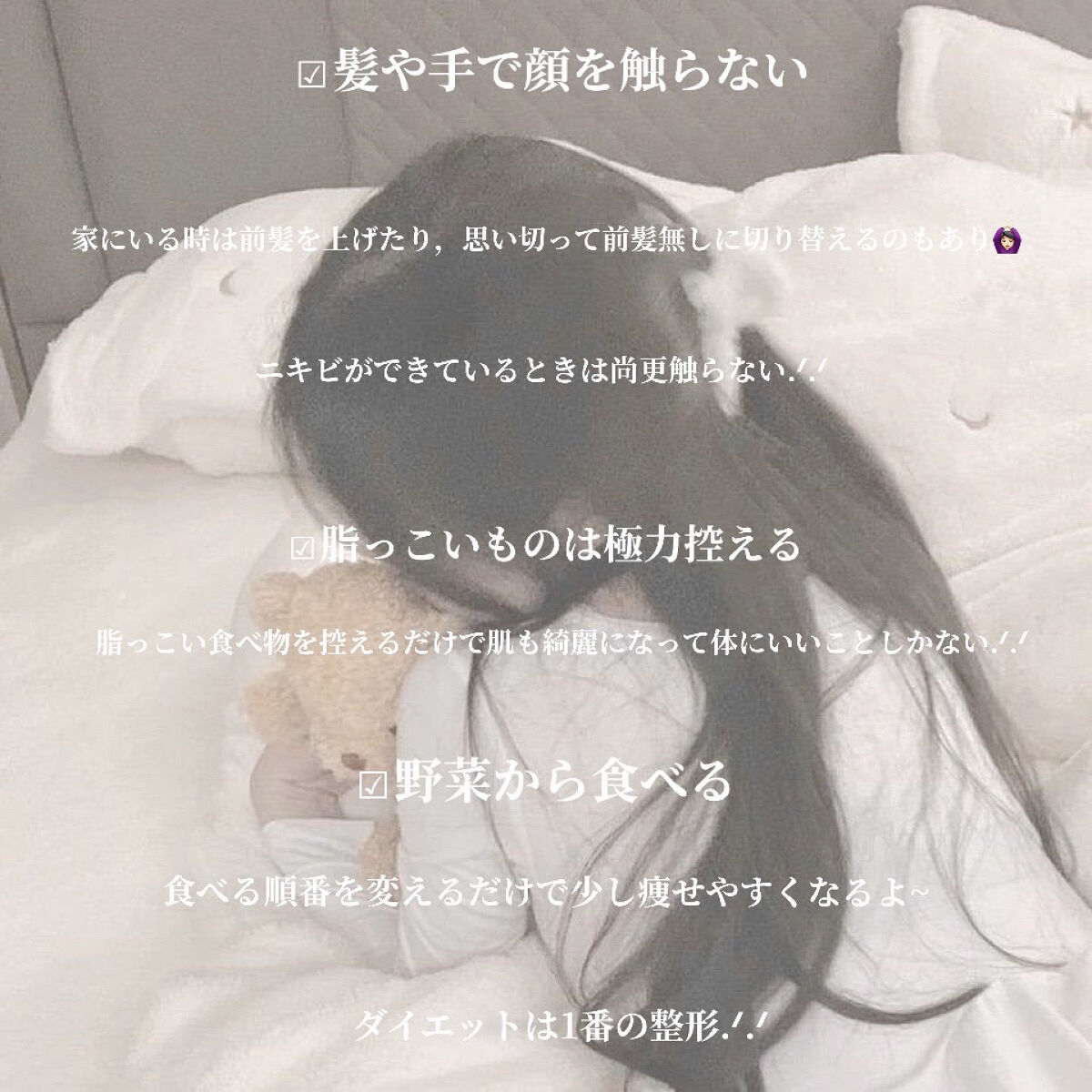 洗顔前にホットタオルで温める 姿勢を意識する 入浴後はマッサージ 朝はむくみ取りをする 髪や手で顔を触らない 脂っこいものは極力控える 野菜から食べる スキンケアを見直してみる 爪を綺麗にする 日焼け止めを毎日塗る 服装を変えてみる マスクを変えてみる 憧れの人を見つけてモチベUp⤴︎⤴︎ 身の回りの整理整頓をしてみる