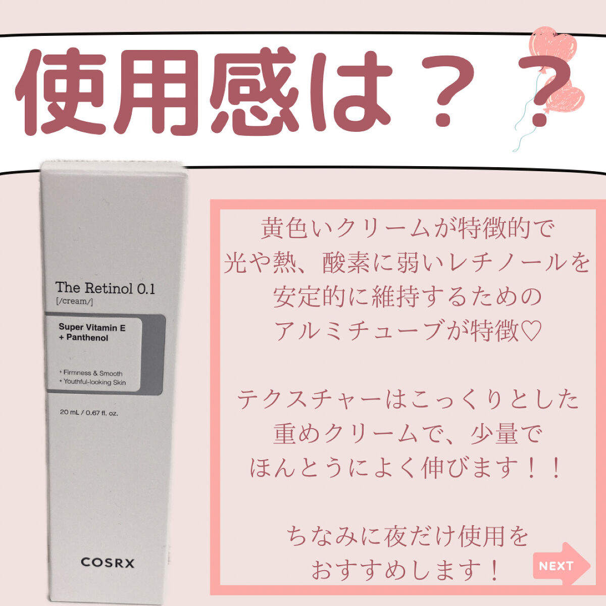 【COSRXTheRetinol0.1Cream】はじめてのレチノール!!初心者でもはじめやすいと聞いてはじめてみました。✔️レチノールって赤みや皮むけが出るって聞いて少し怖かったけど、このクリームはとってもマイルド!✔️パンテノールやビタミ...