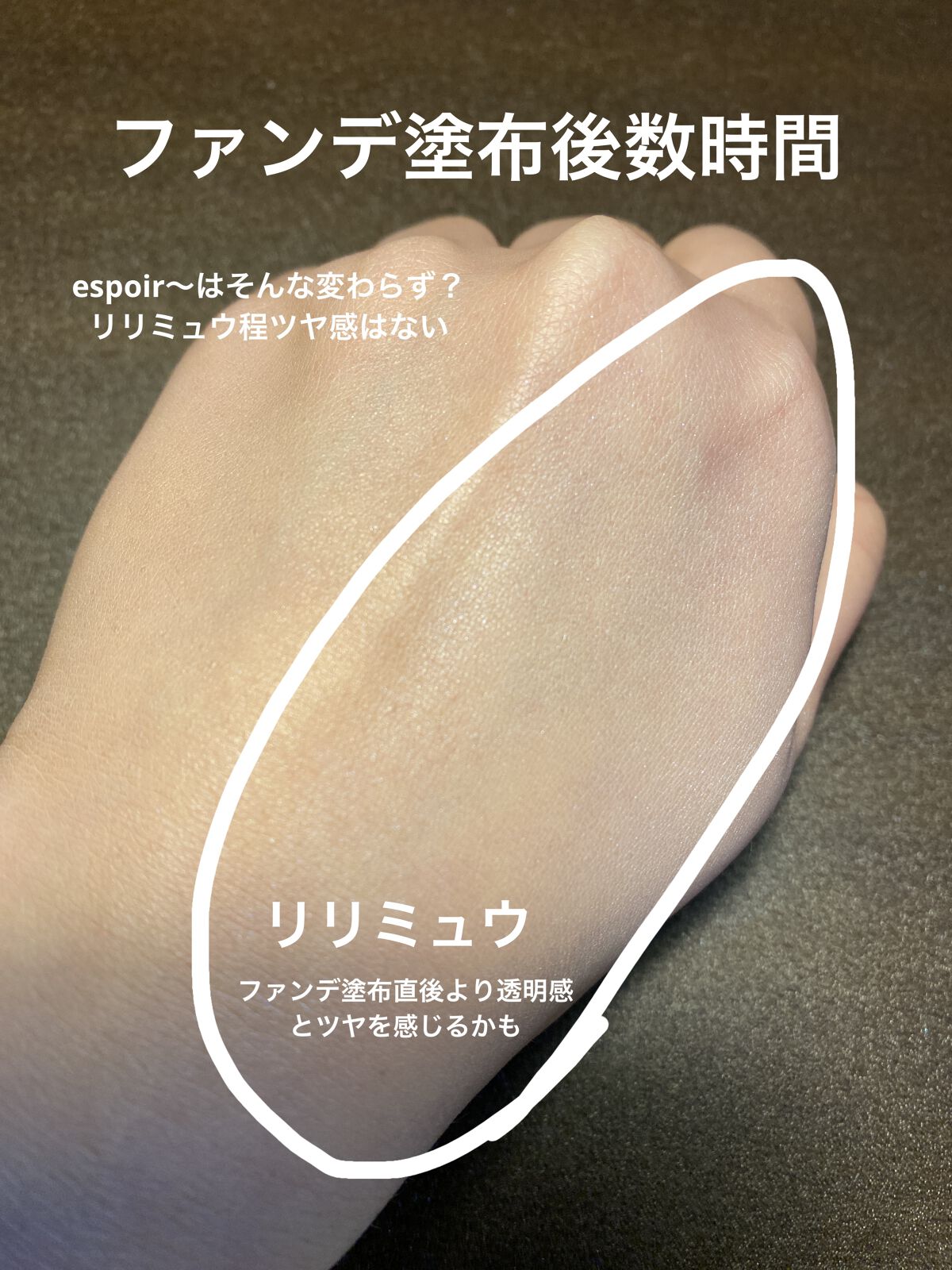 薄づきでツヤっとして軽いです。 自然なツヤだし、化粧直後は肌が綺麗な人!って感じ。 カバー力もあったし化粧直後は綺麗だったので残念。 艶系ですが、カバー力はしっかりある印象でした。 カバー力しっかり、ツヤッツヤの仕上がりになります。