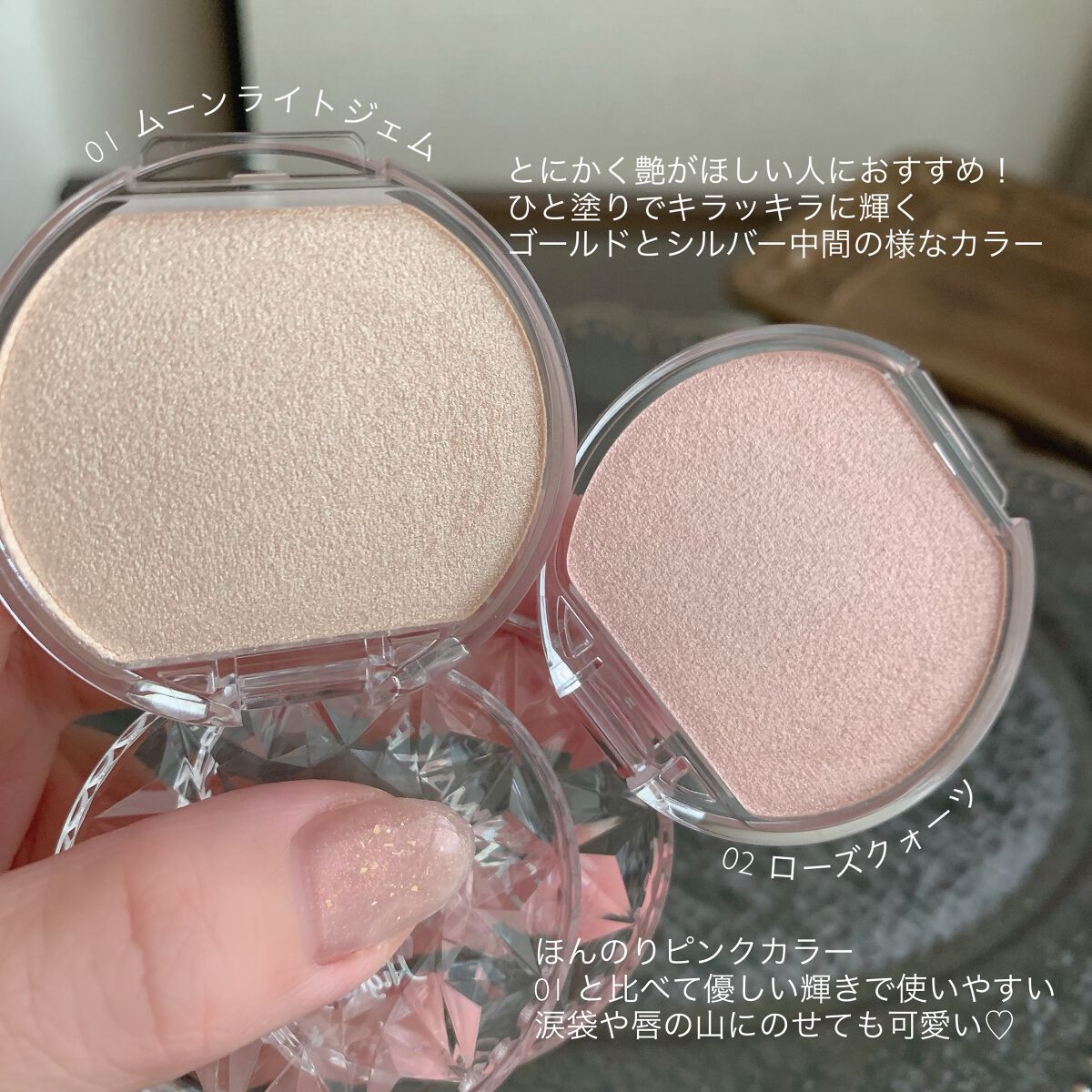 - むにゅっと生レアな質感♡ 繊細パールぎっしり配合のハイライター あふれ出すようなうるっとツヤで、透明感のある光沢肌に仕上がるハイライターです。 ”むにゅっ”とした質感で、お肌にぴたっと密着します。 塗るとサラッとした仕上がりで長時間ヨレにくい!