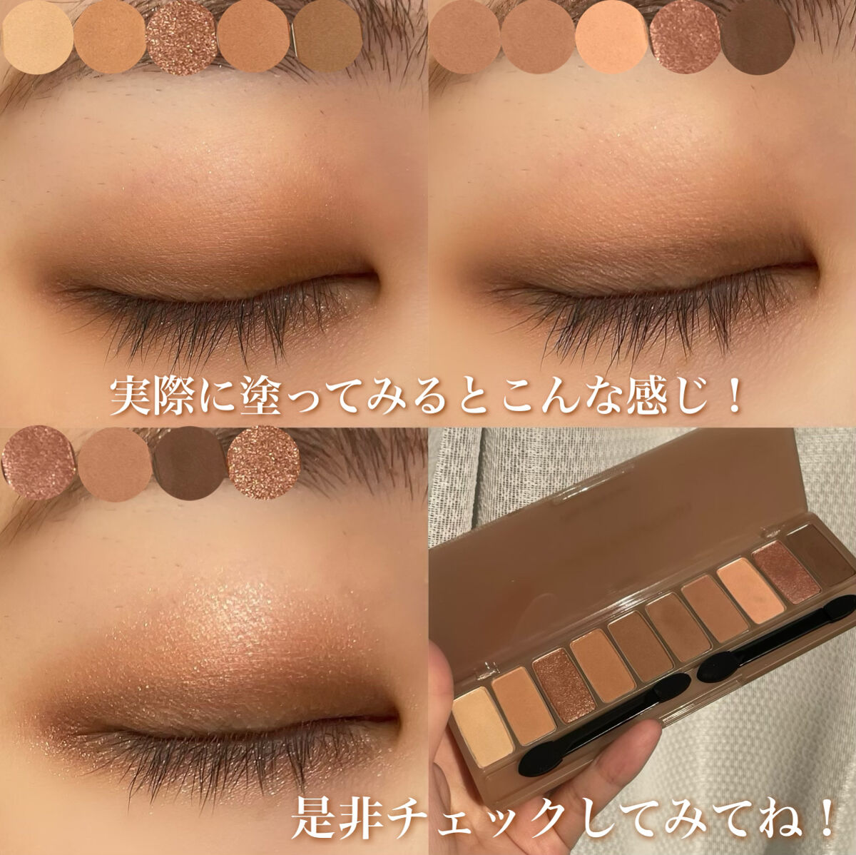 - 肌なじみの良い、鮮やかな発色で目元を華やかに彩る捨て色なしの10色アイシャドウパレット 異なる3種のテクスチャーを自由に組み合わせて、グラデーションも思いのままに。 NEW 2023.4 ・肌トーンにあう配色を詰め込んだトレンドカラー 肌トーンに合わせて、自分に似合うトレンドカラーが楽しめる♡ パーソナルカラー×トレンドカラーの掛け合わせパレットで、デイリーメイクもスペシャルメイクも気分にあわせてなりたい自分に! ・むにゅっとジェル質感ラメで高密着、煌めく目元 パレットの中でもポイントとなる大きめ粒子のラメは、ジェルのような新質感で落ちにくく肌にぴったりと密着します。キラキラとした目元をキープします。 ・使うカラーは大きめに!リアル捨て色なしパレット ベースやラメのよく使うカラーと締め色や濃い色等の減りが少ないカラーを異なるサイズで詰め込んだ、リアル捨て色なしパレット! <使用方法> 付属のデュアルシャドウブラシでベースカラーをまぶた全体に塗り広げます。細いブラシでグラデーションや目尻、アイライン、涙袋などのポイントカラーをのせて仕上げます。