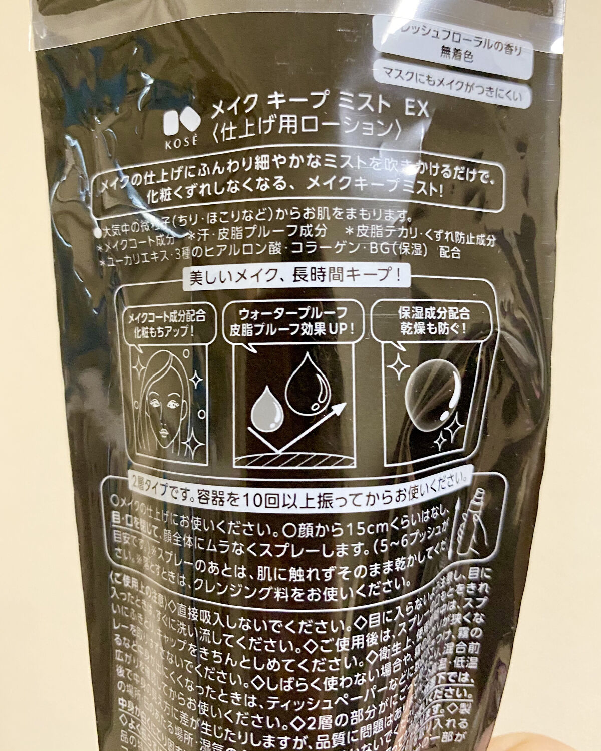 - メイクキープ力がパワーアップ! メイクの仕上げにサッとひと吹き、化粧くずれを防ぐふんわりミストスプレー。 メイクキープ力がパワーアップ! ウォータープルーフ効果に加え、皮脂くずれ防止効果で驚きのメイクキープ力を発揮します。 ● さらに細かくふんわりと噴霧するミストに進化。均一な一枚の膜を作ります。 ● つけたての美しいメイクを長時間持続。 メイクコート成分配合。しっかりとメイクを固定しながら、顔の動きに合わせて伸縮するため、時間がたってもメイクがヨレにくく、美しい仕上がりを長時間持続します。 ● マスク着用によるメイクのヨレを防止し、マスクにメイクが付きにくくします。 ● メイクくずれから守るだけでなく、大気中の微粒子(ちり・ほこりなど)からも肌をまもります。 ● 汗や水、皮脂まではじくため、メイクによるテカリやにじみをしっかりと抑えます。 ● 保湿成分配合。うるおいを与えて乾燥を防ぎます。 ● フレッシュフローラルの香り ● 無着色 <ご注意> 低温下では中身が白く固まりやすくなりますが、 常温に戻すために湯せんや電子レンジなどを使って高い温度で温めると品質が変化してしまいます。 さらには容器が変形・破損することで、やけどや怪我の恐れがあります。 大変危険ですので、湯せんや電子レンジなどを使って加熱することは絶対にお避けください。