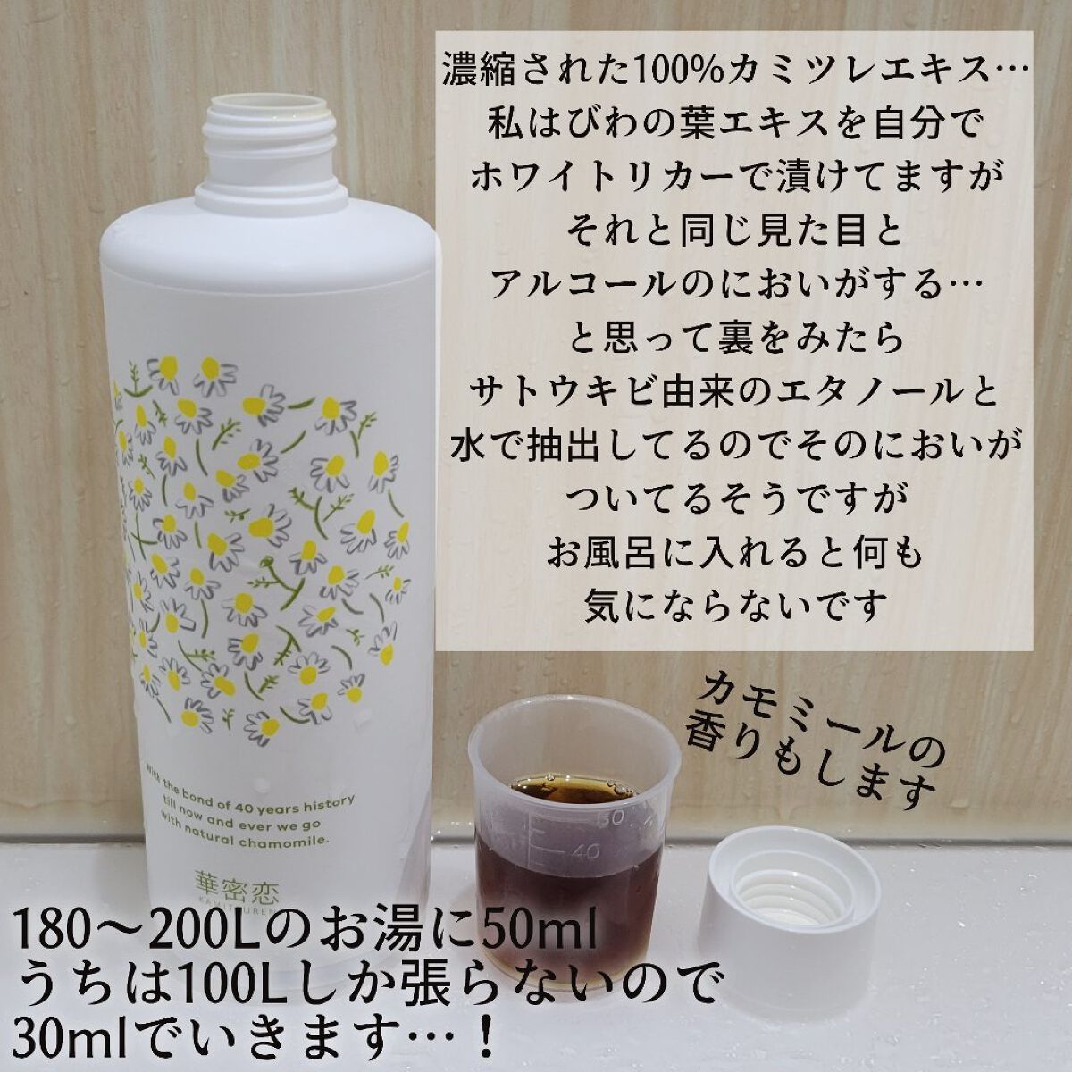 去年の夏も買ったカミツレン、やっぱり今年も買いました。ちょっとお値段が高いから、日常的には使っていないのですが、毎年この時期に結局カミツレンを買ってるなぁ。 こういう時に、カミツレエキス100%の華密恋の入浴剤の入ったお風呂に1週間くらい浸かるようにしています🛀 1週間くらいカミツレンのお風呂に入っていると、あれていた肌が落ち着いてキレイになってくるの✨