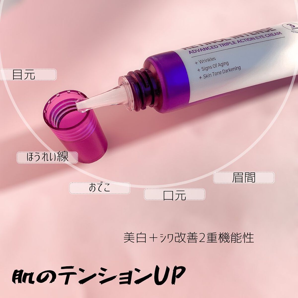 - 目元集中エイジングケア*! おでこ、口元などにもオススメ レチノール*1&レチナール*2配合 大注目成分レチノール*1&レチナール*2を配合、目元、おでこ、口元ケアに特化 レチノール*1&レチナール*2のほかにナイアシンアミド*3を配合し、目元、眉間、おでこ、口元、首など、肌に刻まれた歳月を集中エイジングケア*します。 さらに、ツボクサ、ティーツリー、ヨモギなどの成分も配合され、肌荒れを予防します。 *年齢に応じたケア *1整肌成分 *2整肌成分 *3整肌成分 [使用方法] 洗顔後に化粧水やトナーなどで肌を整えた後、適量を手にとり顔全体に塗り伸ばしてください。