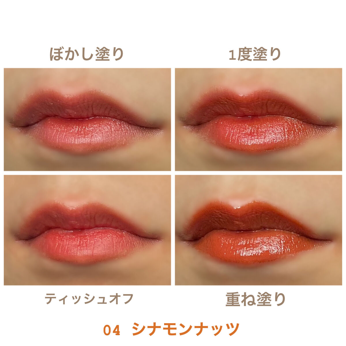 - <01 カーディナルローズ> 水、ダイマージリノール酸ダイマージリノレイル、ジフェニルジメチコン、ジフェニルシロキシフェニルトリメチコン、オクチルドデカノール、トリイソステアリン酸ポリグリセリルー2、ラウロイルグルタミン酸ジ(フィトステリル/オクチルドデシル)、ダイマージリノール酸(フィトステリル/イソステアリル/セチル/ステアリル/ベヘニル)、BG、水添ポリイソブテン、グリセリン、セテスー10、エタノール、セチルPEG/PPGー10/1ジメチコン、(アクリル酸ヒドロキシエチル/アクリロイルジメチルタウリンNa)コポリマー、イソヘキサデカン、フェノキシエタノール、メチルパラベン、ポリソルベート60、トコフェロール、エチルパラベン、デヒドロ酢酸Na、リン酸2Na、リン酸Na、シリカ、シメチコン、ハチミツ、スクワラン、ステアリン酸ソルビタン、ステアリン酸グリセリル、オレイン酸ポリグリセリルー10、セルロースガム、ヒアルロン酸Na、ローズマリー葉エキス、(+/ー)酸化鉄、酸化チタン、アクリレーツコポリマーアンモニウム、赤226、赤227、黄4、ポリアスパラギン酸Na、水酸化Al、PVP、キサンタンガム、EDTAー2Na、青1 <02 クラシカルプラム> 水、ダイマージリノール酸ダイマージリノレイル、ジフェニルジメチコン、ジフェニルシロキシフェニルトリメチコン、オクチルドデカノール、トリイソステアリン酸ポリグリセリルー2、ラウロイルグルタミン酸ジ(フィトステリル/オクチルドデシル)、ダイマージリノール酸(フィトステリル/イソステアリル/セチル/ステアリル/ベヘニル)、BG、水添ポリイソブテン、グリセリン、セテスー10、エタノール、セチルPEG/PPGー10/1ジメチコン、(アクリル酸ヒドロキシエチル/アクリロイルジメチルタウリンNa)コポリマー、イソヘキサデカン、フェノキシエタノール、メチルパラベン、ポリソルベート60、トコフェロール、エチルパラベン、デヒドロ酢酸Na、リン酸2Na、リン酸Na、シリカ、シメチコン、ハチミツ、スクワラン、ステアリン酸ソルビタン、ステアリン酸グリセリル、オレイン酸ポリグリセリルー10、セルロースガム、ヒアルロン酸Na、ローズマリー葉エキス、(+/ー)酸化鉄、酸化チタン、アクリレーツコポリマーアンモニウム、赤226、赤227、黄4、ポリアスパラギン酸Na、水酸化Al、PVP、キサンタンガム、EDTAー2Na、青1 <03 サンゴブロッサム> 水、ダイマージリノール酸ダイマージリノレイル、ジフェニルジメチコン、ジフェニルシロキシフェニルトリメチコン、オクチルドデカノール、トリイソステアリン酸ポリグリセリルー2、ラウロイルグルタミン酸ジ(フィトステリル/オクチルドデシル)、ダイマージリノール酸(フィトステリル/イソステアリル/セチル/ステアリル/ベヘニル)、BG、水添ポリイソブテン、グリセリン、セテスー10、エタノール、セチルPEG/PPGー10/1ジメチコン、(アクリル酸ヒドロキシエチル/アクリロイルジメチルタウリンNa)コポリマー、イソヘキサデカン、フェノキシエタノール、メチルパラベン、ポリソルベート60、トコフェロール、エチルパラベン、デヒドロ酢酸Na、リン酸2Na、リン酸Na、シリカ、シメチコン、ハチミツ、スクワラン、ステアリン酸ソルビタン、ステアリン酸グリセリル、オレイン酸ポリグリセリルー10、セルロースガム、ヒアルロン酸Na、ローズマリー葉エキス、(+/ー)酸化鉄、酸化チタン、アクリレーツコポリマーアンモニウム、赤226、赤227、黄4、ポリアスパラギン酸Na、水酸化Al、PVP、キサンタンガム、EDTAー2Na、青1 <04 シナモンナッツ> 水、ダイマージリノール酸ダイマージリノレイル、ジフェニルジメチコン、ジフェニルシロキシフェニルトリメチコン、オクチルドデカノール、トリイソステアリン酸ポリグリセリルー2、ラウロイルグルタミン酸ジ(フィトステリル/オクチルドデシル)、ダイマージリノール酸(フィトステリル/イソステアリル/セチル/ステアリル/ベヘニル)、BG、水添ポリイソブテン、グリセリン、セテスー10、エタノール、セチルPEG/PPGー10/1ジメチコン、(アクリル酸ヒドロキシエチル/アクリロイルジメチルタウリンNa)コポリマー、イソヘキサデカン、フェノキシエタノール、メチルパラベン、ポリソルベート60、トコフェロール、エチルパラベン、デヒドロ酢酸Na、リン酸2Na、リン酸Na、シリカ、シメチコン、ハチミツ、スクワラン、ステアリン酸ソルビタン、ステアリン酸グリセリル、オレイン酸ポリグリセリルー10、セルロースガム、ヒアルロン酸Na、ローズマリー葉エキス、(+/ー)酸化鉄、酸化チタン、アクリレーツコポリマーアンモニウム、赤226、赤227、黄4、ポリアスパラギン酸Na、水酸化Al、PVP、キサンタンガム、EDTAー2Na、青1 <05 カヌレブラウン> 水、ダイマージリノール酸ダイマージリノレイル、ジフェニルジメチコン、ジフェニルシロキシフェニルトリメチコン、オクチルドデカノール、トリイソステアリン酸ポリグリセリルー2、ラウロイルグルタミン酸ジ(フィトステリル/オクチルドデシル)、ダイマージリノール酸(フ