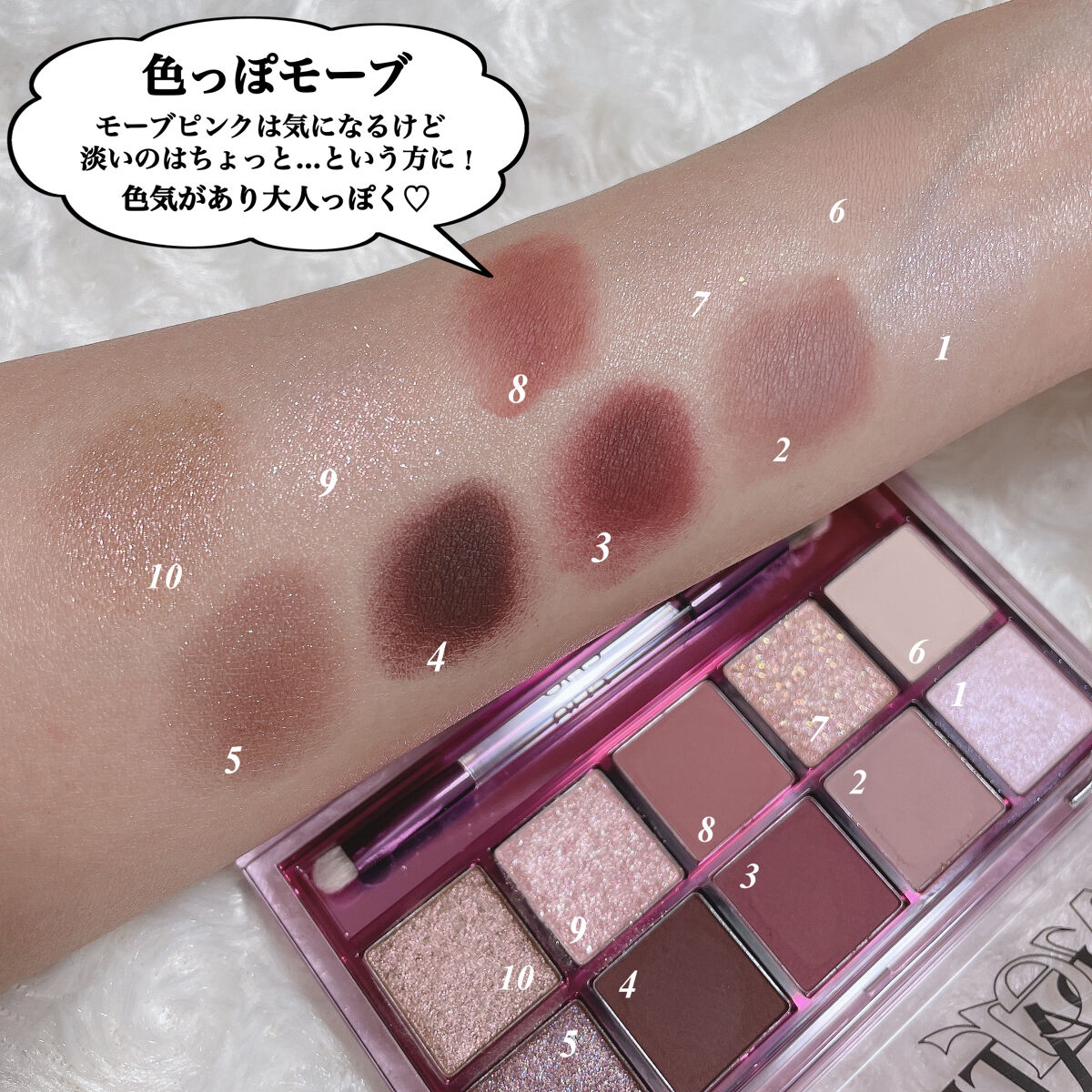- ひとつのパレットにマット、シマー、グリッターなど多様な質感を贅沢に使用。塗る順序やカラーの組み合わせを変えるだけでデイリーメイクにも、特別な日のお出かけメイクにもできる優れもの。また粉飛びせず、まぶたにしっかり密着します。