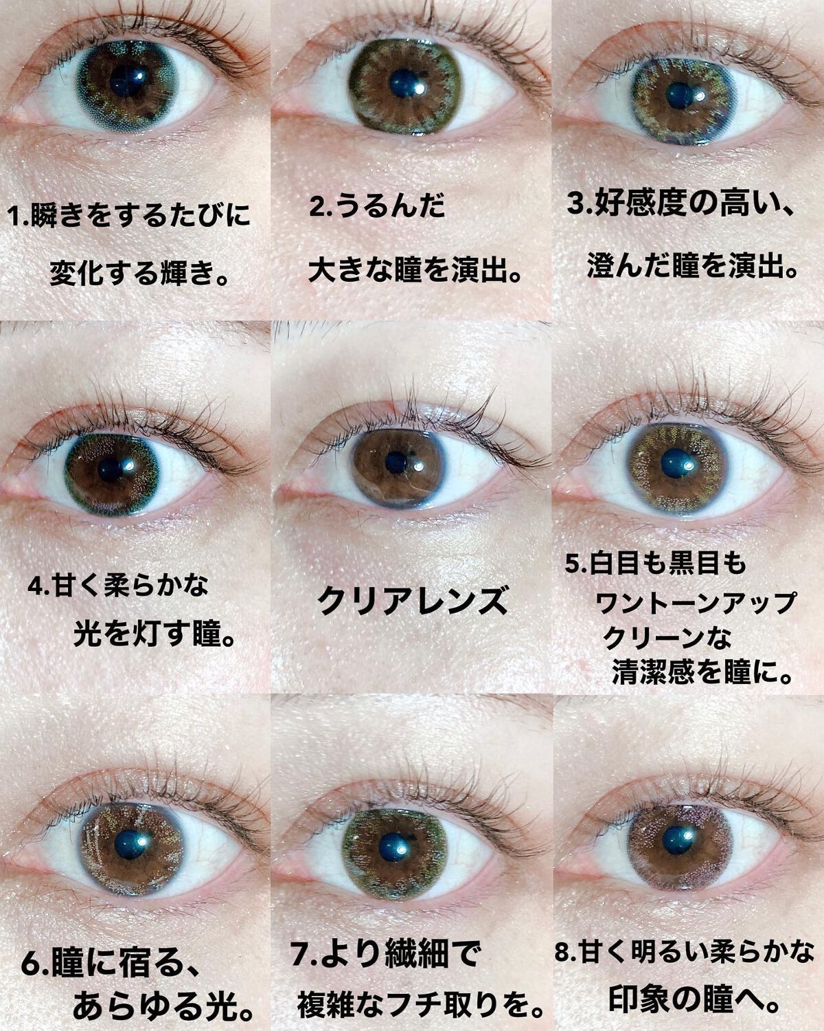 - 「左右⾮対称なデザイン」で「本来の⾃分の瞳の輝きを⽣かす」「⾊」ではなく、瞳に⼊る「光」を再現した今までとは異なる発想のこだわりデザインレンズ ⿊⽬を⼤きく、瞳を⾊付けることを⽬的とした従来のカラーコンタクトレンズとは異なる発想で、瞳の中でキラキラと輝く光を表現し、透明感と潤いに溢れた瞳を実現。 繊細な⾊合いとそれを左右⾮対称に配したデザインによって、柔らかく朗らかな印象を⾃然に演出します。 発光するような瞳は、視線を集めるので⼩顔感も期待できます。 着色直径 6:12.1mm、1~4,6,7:13.0mm、5,8:14.0mm 直径(DIA) 6:14.0mm、1~4,6,7:14.2mm、5,8:14.5mm ベースカーブ 1~5,7,8:8.6mm、6:8.7mm 度数 0.00、-0.50D〜-10.00D 含⽔率 38%