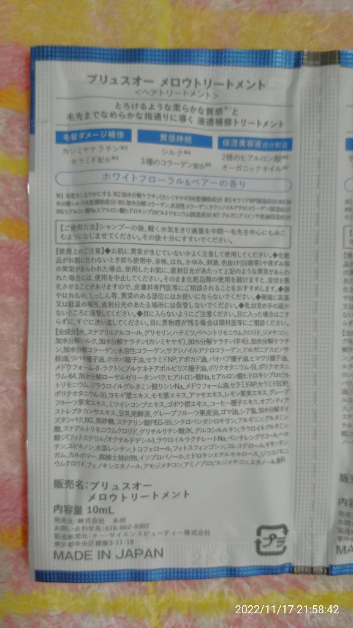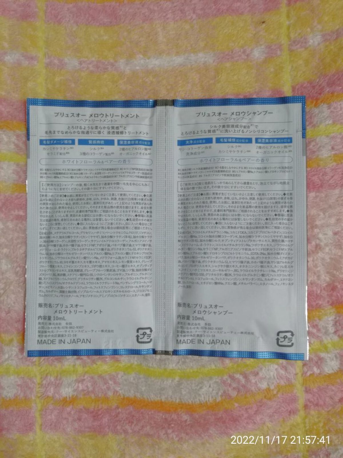 - <シャンプー 450ml> 水、ラウロイルメチルアラニンNa、コカミドDEA、コカミドプロピルベタイン、ココイルグルタミン酸Na、ココイル加水分解コラーゲンK、加水分解ケラチン(カシミヤヤギ)、加水分解ケラチン(羊毛)、加水分解シルク、オプンティアストレプタカンサエキス、異性化糖、ヘマチン、メドウフォーム-δ-ラクトン、ココイルメチルタウリンNa、ツボクサエキス、ジラウロイルグルタミン酸リシンNa、セラミドNP、アルガニアスピノサ核油、セラミドEOP、セラミドAP、ヒアルロン酸Na、ヒアルロン酸ヒドロキシプロピルトリモニウム、EDTA-2Na、加水分解ダイズタンパク、加水分解ローヤルゼリータンパク、ポリクオタニウム-10、ポリクオタニウム-7、アボカド油、バオバブ種子油、ポリクオタニウム-51、ヒマワリ種子油、ホホバ種子油、ヤシ油アルキルグルコシド、プロポリスエキス、シャクヤク根エキス、オタネニンジン根エキス、カミツレ花エキス、ハチミツ、ハチミツエキス、ローヤルゼリー、BG、ラウロイルラクチレートNa、グリセリン、ジステアリン酸PEG-150、グリチルリチン酸2K、ラウロイルグルタミン酸ジ(フィトステリル/オクチルドデシル)、トコフェロール、フィトスフィンゴシン、キサンタンガム、カルボマー、エチドロン酸、コレステロール、エチドロン酸4Na、クエン酸、メチルパラベン、エタノール、フェノキシエタノール、香料 <トリートメント 450ml> 水、ステアリルアルコール、グリセリン、ハチミツ、ベヘントリモニウムクロリド、ジメチコン、加水分解ケラチン(カシミヤヤギ)、加水分解シルク、加水分解コラーゲン、水溶性コラーゲン、サクシノイルアテロコラーゲン、加水分解ケラチン(羊毛)、加水分解ケラチン、アルガニアスピノサ核油、ツバキ種子油、ホホバ種子油、セラミドNP、アボカド油、バオバブ種子油、ヒマワリ種子油、メドウフォーム-δ-ラクトン、プルケネチアボルビリス種子油、ポリクオタニウム-51、ポリクオタニウム-64、加水分解ローヤルゼリータンパク、ヒアルロン酸Na、ヒアルロン酸ヒドロキシプロピルトリモニウム、ジラウロイルグルタミン酸リシンNa、メドウフォーム油、セラミドAP、セラミドEOP、ポリクオタニウム-10、ヨモギ葉エキス、モモ葉エキス、アマモエキス、レモン果実エキス、グレープフルーツ果実エキス、ミツイシコンプエキス、ゴボウ根エキス、コーヒー種子エキス、アプンティアストレプタカンサエキス、豆乳発酵液、グレープフルーツ果皮油、ゴマ油、シア脂、加水分解ダイズタンパク、BG、黒砂糖、ステアリン酸PEG-55、シクロベンタシロキサン、アルギニン、グルタミン酸、ステアルトリモニウムクロリド、グリチルリチン酸2K、グルコシルルチン、ラウロイウグルタミン酸ジ(フィトステリル/オクチルドデシル)、ラウロイルラクチレートNa、ベンチレングリコール、ヘマチン、ユビキノン、水添レシチン、トコフェロール、フィトスフィンゴシン、コレステロール、キサンタンガム、カルポマー、腐植土抽出物、イソプロパノール、ヒドロキシエチルセルロース、ジココジモニウムクロリド、フェノキシエタノール、アモジメチコン、アミノプロピルジメチコン、エタノール、香料 <シャンプー詰替用 350ml> 水、ラウロイルメチルアラニンNa、コカミドDEA、コカミドプロピルベタイン、ココイルグルタミン酸Na、加水分解ケラチン(カシミヤヤギ)、加水分解ケラチン(羊毛)、加水分解シルク、ココイル加水分解コラーゲンK、オプンティアストレプタカンサエキス、異性化糖、ヘマチン、メドウフォーム-δ-ラクトン、ココイルメチルタウリンNa、ツボクサエキス、ジラウロイルグルタミン酸リシンNa、セラミドNP、アルガニアスピノサ核油、セラミドEOP、セラミドAP、ヒアルロン酸Na、ヒアルロン酸ヒドロキシプロピルトリモニウム、EDTA-2Na、加水分解ダイズタンパク、加水分解ローヤルゼリータンパク、ポリクオタニウム-10、ポリクオタニウム-7、アボカド油、バオバブ種子油、ポリクオタニウム-51、ヒマワリ種子油、ホホバ種子油、ヤシ油アルキルグルコシド、プロポリスエキス、シャクヤク根エキス、オタネニンジン根エキス、カミツレ花エキス、ハチミツ、ハチミツエキス、ローヤルゼリー、BG、ラウロイウラクチレートNa、グリセリン、ジステアリン酸PEG-150、グリチルリチン酸2K、ラウロイルグルタミン酸ジ(フィトステリル/オクチルドデシル)、トコフェロール、フィトスフィンゴシン、キサンタンガム、カルポマー、エチドロン酸、コレステロール、エチドロン酸4Na、クエン酸、メチルパラベン、エタノール、フェノキシエタノール、香料 <トリートメント詰替用 350ml> 水、ステアリルアルコール、グリセリン、ハチミツ、ベヘントリモニウムクロリド、ジメチコン、加水分解シルク、加水分解ケラチン(カシミヤヤギ)、加水分解ケラチン(羊毛)、加水分解ケラチン、加水分解コラーゲン、水溶性コラーゲン、サクシノイルアテロコラーゲン、アルガニアスピノ