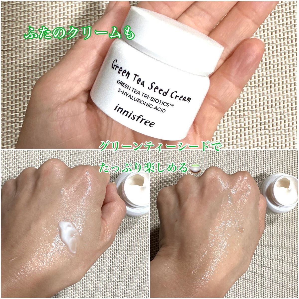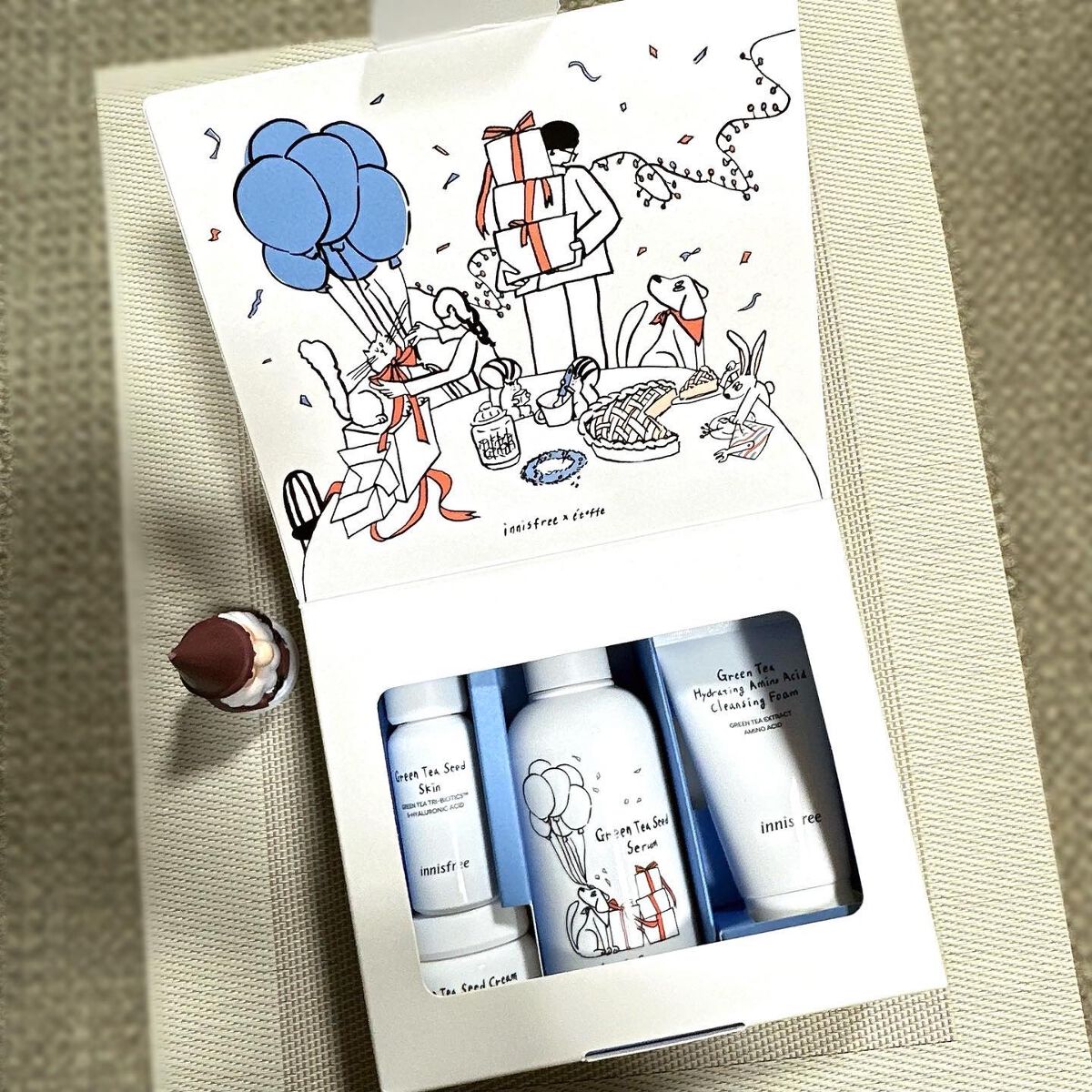 innisfreeグリーンティーセラミドバリアクリームを使っている方、必見❣️グリーンティーセラミドバリアクリームセットはいつもの値段でギフトが3つも付いてくる‼️美容茶葉*1×セラミド*2の密封、バタークリーム*3に、グリーンティーラインの...