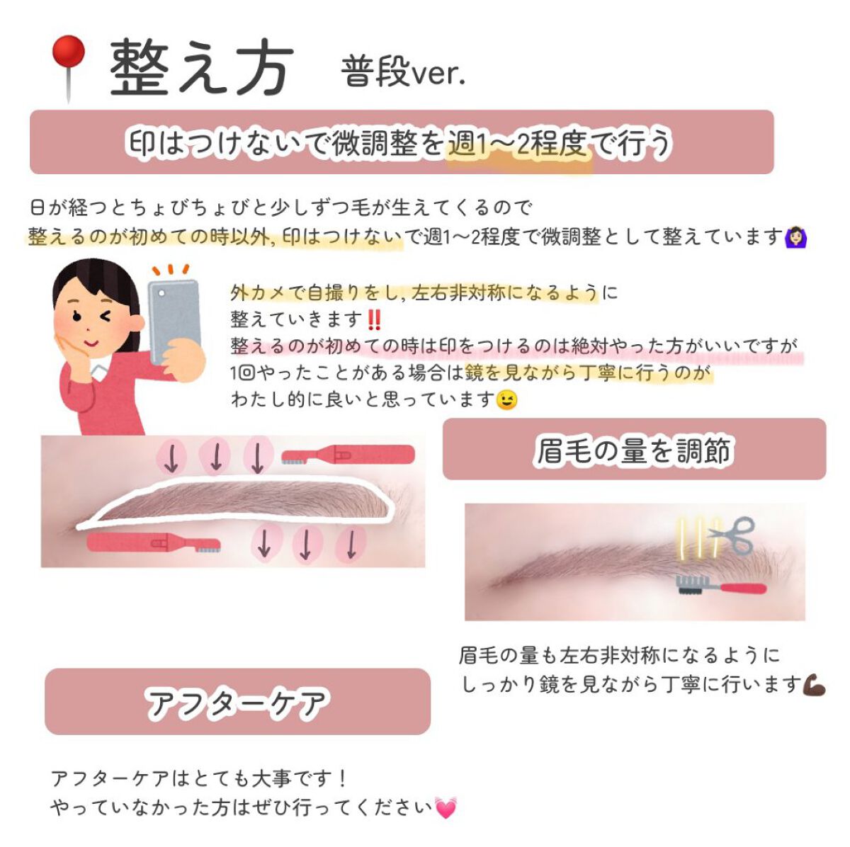 眉頭は目頭の真上 眉山は目尻の真上 眉尻は小鼻と目尻をつないだところ 眉頭を目頭よりも内側にすると… "綺麗めな印象に" 眉頭を目頭の真上にすると… "やさしい印象に" アイブロウパウダーで, ふちどった中に塗ります^_^︎ ふちどった内側は絶対に剃らない!!!丁寧に気をつけながら行うこと!!! 眉の量の毛先をちょきちょきする感じです✂︎ アイブロウコームを使って慎重に行います!!! セザンヌのアイライナーを使ってわたしはつないでいました‼️ 眉尻側を主にしっかりとふちどります.