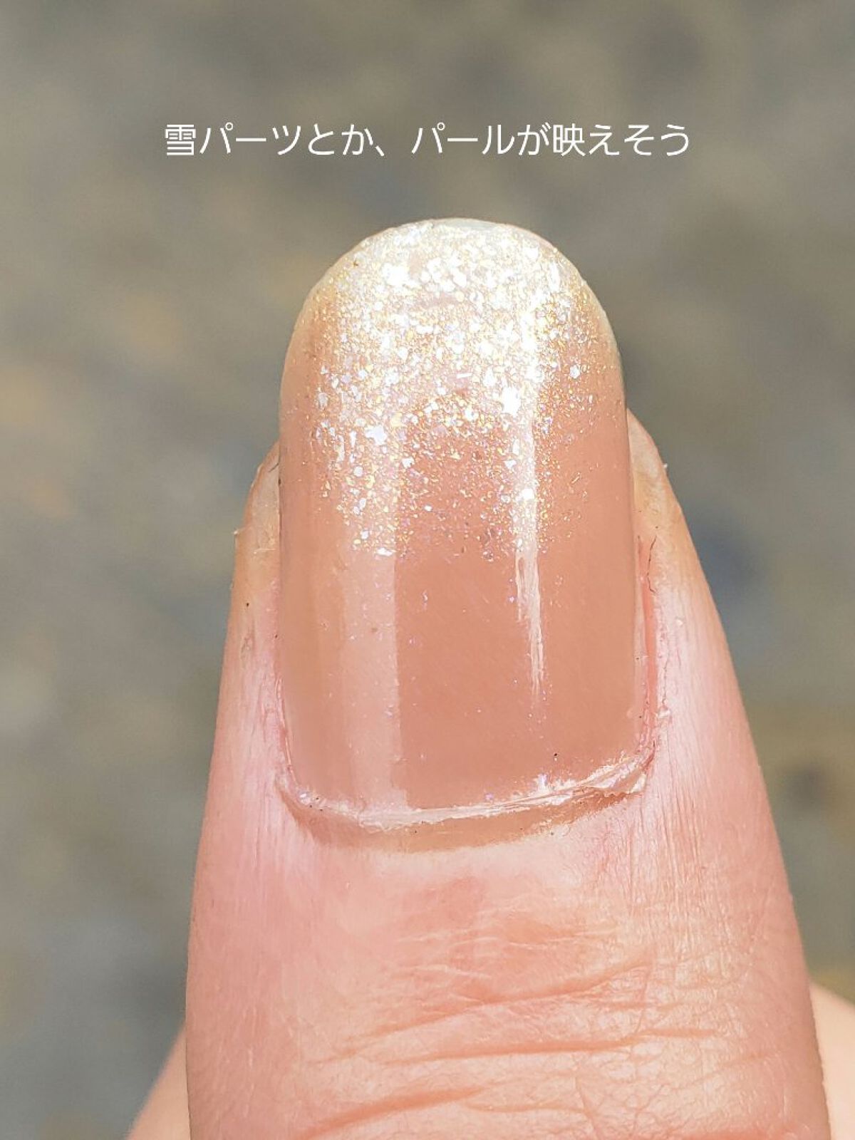 今日のネイル💅 会社に行くにはちょい派手だけど、土曜だし、ヌーディーカラーだから許して(* >ω<) ✼••┈┈••✼••┈┈••✼••┈┈••✼••┈┈••✼ 【使ったもの】 パラドゥミニネイル BR07 スモーキークォーツ CANMAKE N66 ピクシーダスト paプラス ピールオフベースコート plus05 ネイリスト クイッククリスタルコートⅡ 【やり方】 1.スモーキークォーツを2度塗り 2.爪の先からピクシーダストでグラデーションを作る 3.トップコートで仕上げ 🔹ポイント グラデーションの作り方は我流だけど…  まず濃くしたいところ(先の方)にラメをのせて乾かす。 次はラメのハケよくしごいて、ポリッシュが少ない状態で 境目の部分をなぞるように動かす。 最後にバランスを見て先の方にラメを足すか、グラデーションの幅を増やす。 ✼••┈┈••✼••┈┈••✼••┈┈••✼••┈┈••✼ 光が当たるとキラキラきれいなラメグラデーション! スモーキークォーツの2度塗りは、なんだかのっぺりした印象を受けてしまうから、いつもはやらないんだけど、ピクシーダストと合わせたらすごく良い感じ😊 休みの日だったら、雪パーツやパールをつけたかったなぁ。 それはまた次の機会🎵 #セルフネイル #ネイル記録