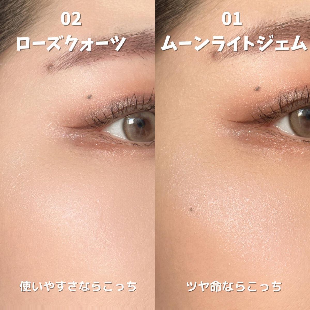 - <01 ムーンライトジェム> トリエチルヘキサノイン、合成フルオロフロゴパイト、ジメチコン、リンゴ酸ジイソステアリル、(ジメチコン/ビニルジメチコン)クロスポリマー、シリカ、スクワラン、オリーブ果実油、セラミドNP、ホホバ種子油、カニナバラ果実油、パルミチン酸レチノール、ツボクサ葉エキス、BG、マイクロクリスタリンワックス、パラフィン、トコフェロール、フェノキシエタノール、メチルパラベン、ジパルミチン酸アスコルビル、酸化チタン、酸化鉄、水酸化Al、酸化スズ <02 ローズクォーツ> トリエチルヘキサノイン、合成フルオロフロゴパイト、ジメチコン、リンゴ酸ジイソステアリル、(ジメチコン/ビニルジメチコン)クロスポリマー、シリカ、スクワラン、オリーブ果実油、セラミドNP、ホホバ種子油、カニナバラ果実油、パルミチン酸レチノール、ツボクサ葉エキス、BG、マイクロクリスタリンワックス、パラフィン、トコフェロール、フェノキシエタノール、メチルパラベン、ジパルミチン酸アスコルビル、マイカ、酸化チタン、酸化鉄、赤202、水酸化Al、酸化スズ <03 ウォームルチル> トリエチルヘキサノイン、ジメチコン、合成フルオロフロゴパイト、リンゴ酸ジイソステアリル、(ジメチコン/ビニルジメチコン)クロスポリマー、シリカ、スクワラン、オリーブ果実油、セラミドNP、ホホバ種子油、カニナバラ果実油、パルミチン酸レチノール、ツボクサ葉エキス、BG、マイクロクリスタリンワックス、パラフィン、トコフェロール、フェノキシエタノール、メチルパラベン、ジパルミチン酸アスコルビル、マイカ、酸化チタン、酸化鉄、水酸化Al、酸化スズ <04 ブルートパーズ> トリエチルヘキサノイン、ジメチコン、合成フルオロフロゴパイト、リンゴ酸ジイソステアリル、(ジメチコン/ビニルジメチコン)クロスポリマー、シリカ、スクワラン、オリーブ果実油、セラミドNP、ホホバ種子油、カニナバラ果実油、パルミチン酸レチノール、ツボクサ葉エキス、BG、マイクロクリスタリンワックス、パラフィン、トコフェロール、フェノキシエタノール、メチルパラベン、ジパルミチン酸アスコルビル、マイカ、酸化チタン、コンジョウ、グンジョウ、水酸化Al、酸化スズ