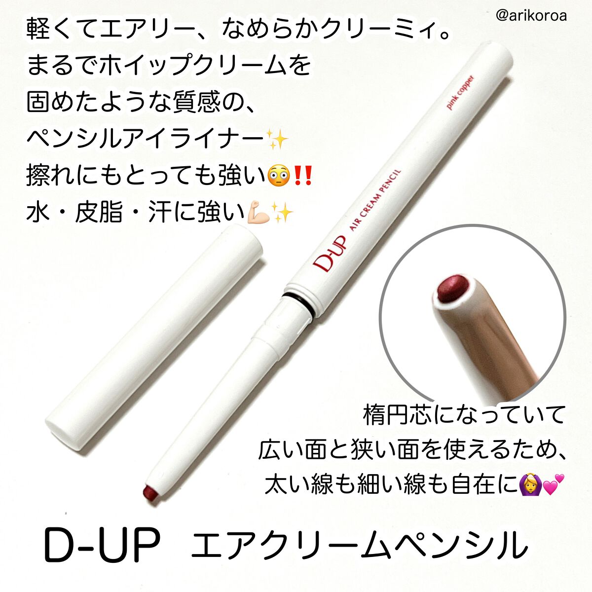 - ※2024年9月〜パッケージ順次リニューアル。尚、これにかかる商品の返品・交換は承っておりません。 「軽くてエアリー、なめらかクリーミィ」 ホイップを固めたような“ふわとろ”質感の新アイライナー ▶摩擦を抑えた描き心地!触れるだけで“スーッ”とほどける「空気感タッチ」 なめらかな描き心地で、まつ毛の隙間や肌の凹凸に引っかからずに狙い通りにラインが描ける。 ▶新形状の極細楕円芯!「キワ埋め」も「目尻」も自在 狙った場所に自在に描ける「1.3㎜×2.5㎜」の新形状。極細ラインもテクニックレス。 ▶ピタッと高密着!高い耐久性。水汗皮脂に強いスーパーウォータープルーフ* まぶたにピタッと密着して、マスクでもよれにくい。 *ディーアップ アイライナーにおいて ・シナモンブラウン “肌になじむ、柔らか 抜け感くすみブラウン” 抜け感と締め感を両立し、ナチュラルに盛れる ・ピーチブラウン “ビターなほんのり赤み系ブラウン” まるでまつ毛の密度が上がったように、自然に目元を大きく見せる ・ソイラテブラウン (2022年10月9日発売) 肌にふわっと溶け込む、まろやかな“ラテカラー” 軽やかなのに深みのある色味で自然と瞳を強調