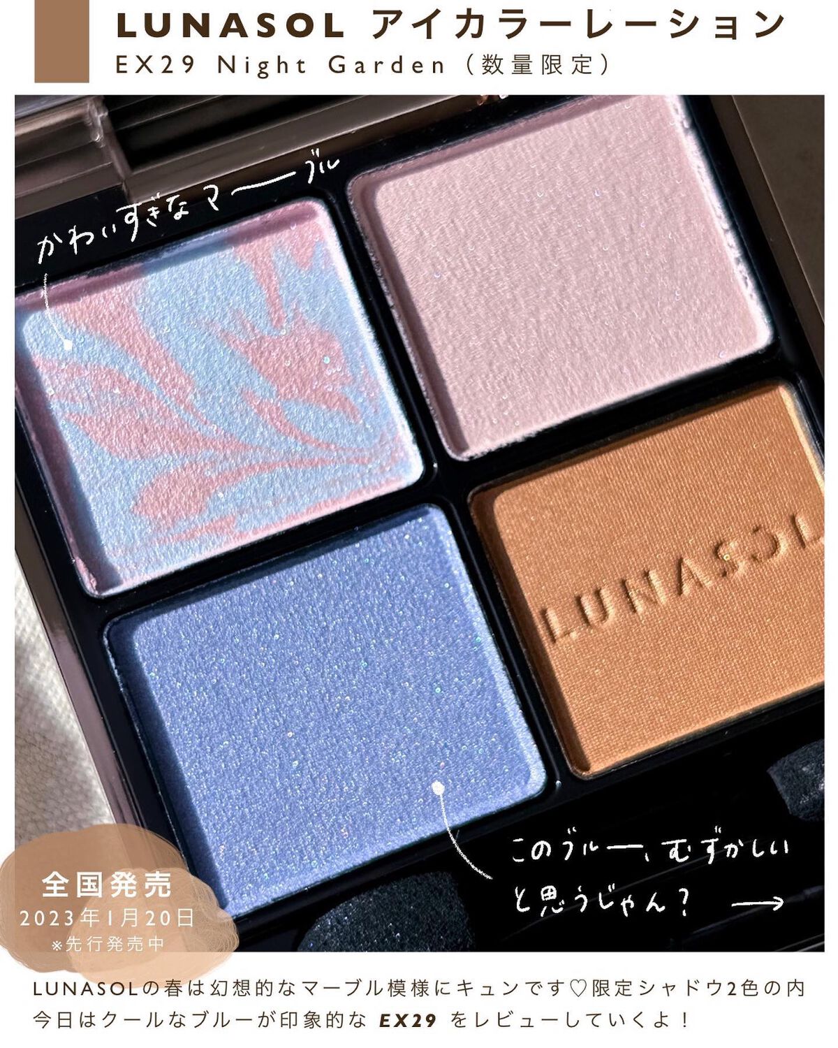 LUNASOLの冬コレで発売になったアイカラーレーションの限定色❣️ EX04は冷たく澄んだ空気に凍りつく薔薇のように凛としたフロステッドローズ🫰 透明感爆上げで目の下に乗せてもかわいい! パープルも締め色のブラウンも淡めのカラーで、組み合わせや乗せ方次第で色んなパターン楽しめます🥰 ルナソルはラメが本当に綺麗で好きすぎる! オンラインまだ在庫あったよ🌷