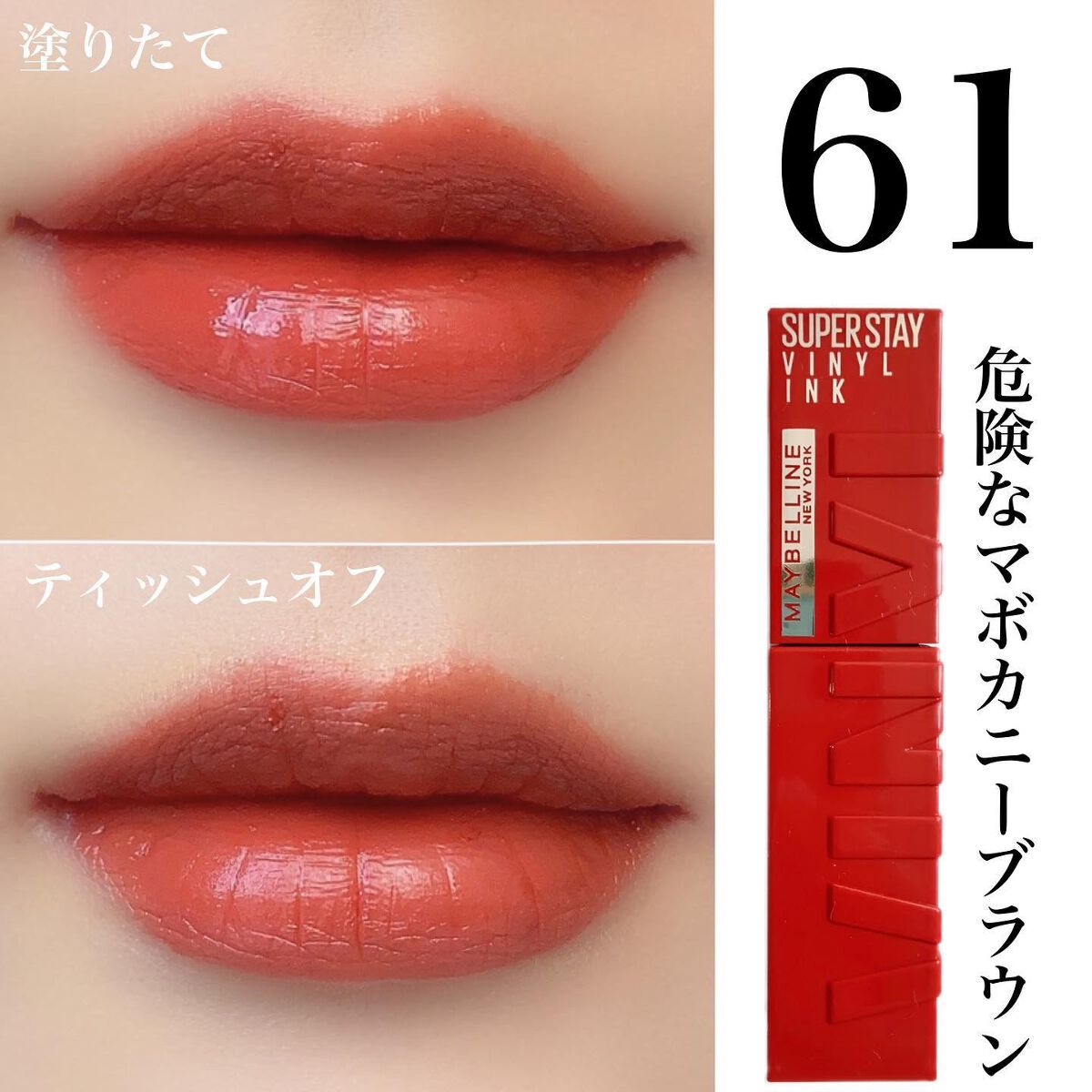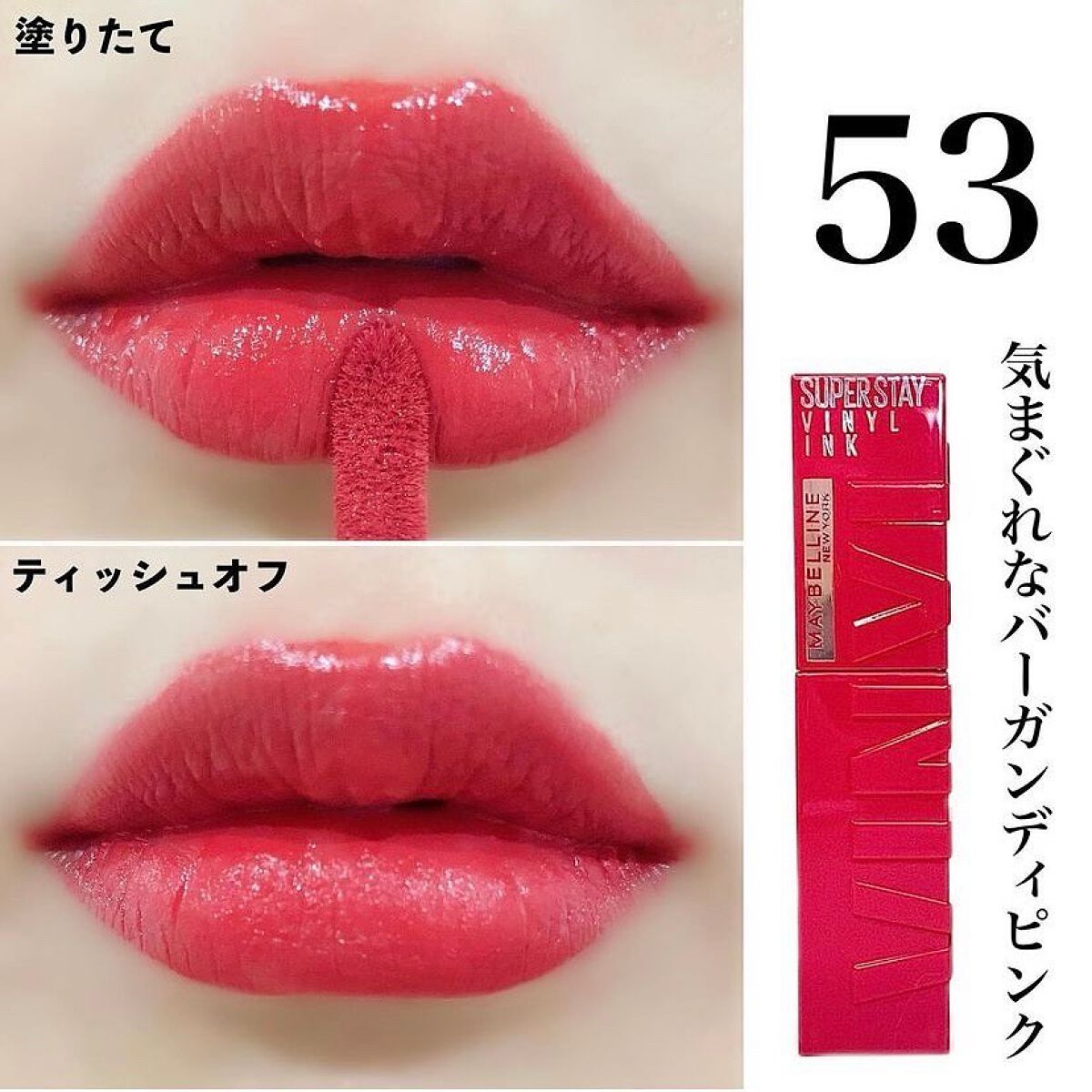 - メイベリン人気No.1リップ からツヤタイプついに誕生!*1 シャカシャカ振って!#落ちないリップ*2 色・ツヤ・仕上がり、全てロック。 〈製品特徴〉 ①シャカシャカ振って、長持ち効果! 膜形成成分*3と高濃度ピグメント*4の2層構造。 シャカシャカ振ると膜形成成分*3と高濃度ピグメント*4が混ざり、 色、ツヤ、仕上がりの長持ち効果! ②色もツヤも落ちない! 最長16時間続く、#落ちないリップ*2 メイベリン独自のトリプルロックフォーミュラ。色・ツヤ・仕上がり、全てロック。 食べても、飲んでも、塗りたての仕上がりが落とすまで続く。*2 ③濃密な発色とツヤをひと塗りで。 塗った瞬間、ムラなく発色。 顔色まで明るくトーンアップするような仕上がりに。*5 ④唇を包み込み、うるおい感ある仕上がりに。 乾燥しにくく、一日中*6心地良い仕上がりに。 塗った瞬間、唇をふっくらとみせ、縦じわが目立ちにくい。 *1:インテージSRI+調べ。2018年9月~2022年7月までのスーパー、ドラッグストア等におけるメイベリン ニューヨーク リップカテゴリーでの売上金額に基づく。 *2:着用16時間を想定した最長の場合において。メイクアップリムーバーで落とすことが可能です。メイベリン ニューヨーク調べ。個人差があります。 *3:トリメチルシロキシケイ酸、ポリプロピルシルセスキオキサン、アルキル(C30-45)ジメチルシリルポリプロピルシルセスキオキサン、ポリメチルシルセスキオキサン/トリメチルシロキシケイ酸。 *4:メイベリン従来品(ウォーター シャイニー ボリューミー パール)と比較において、3倍のピグメントを配合 *5:メイクアップ効果 *6:メイベリン ニューヨーク調べ。個人差があります。