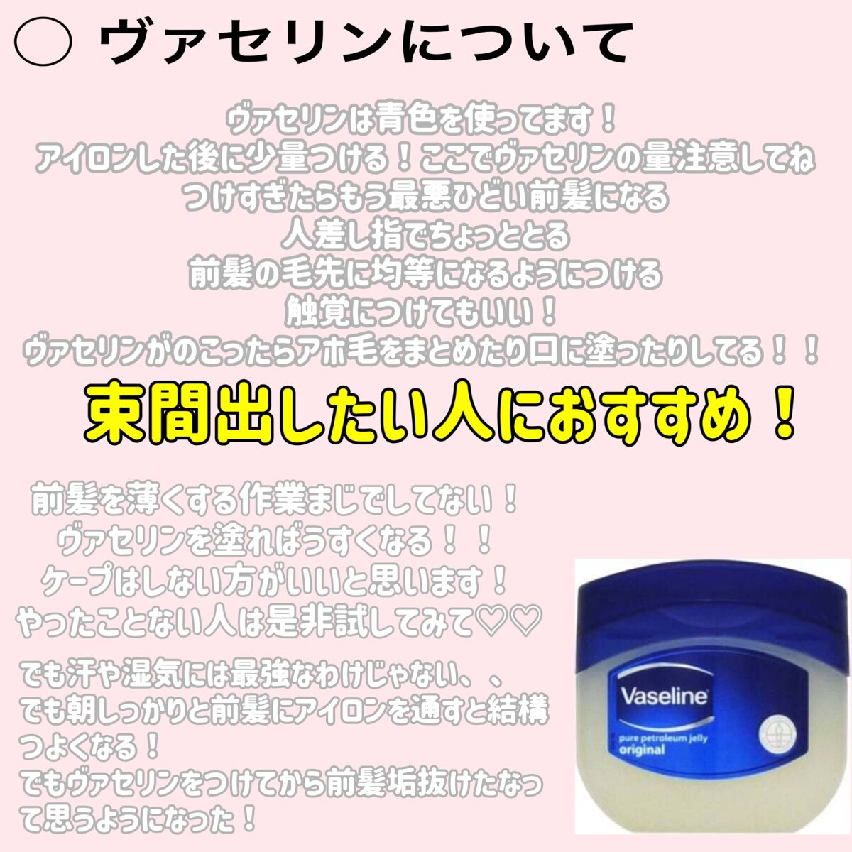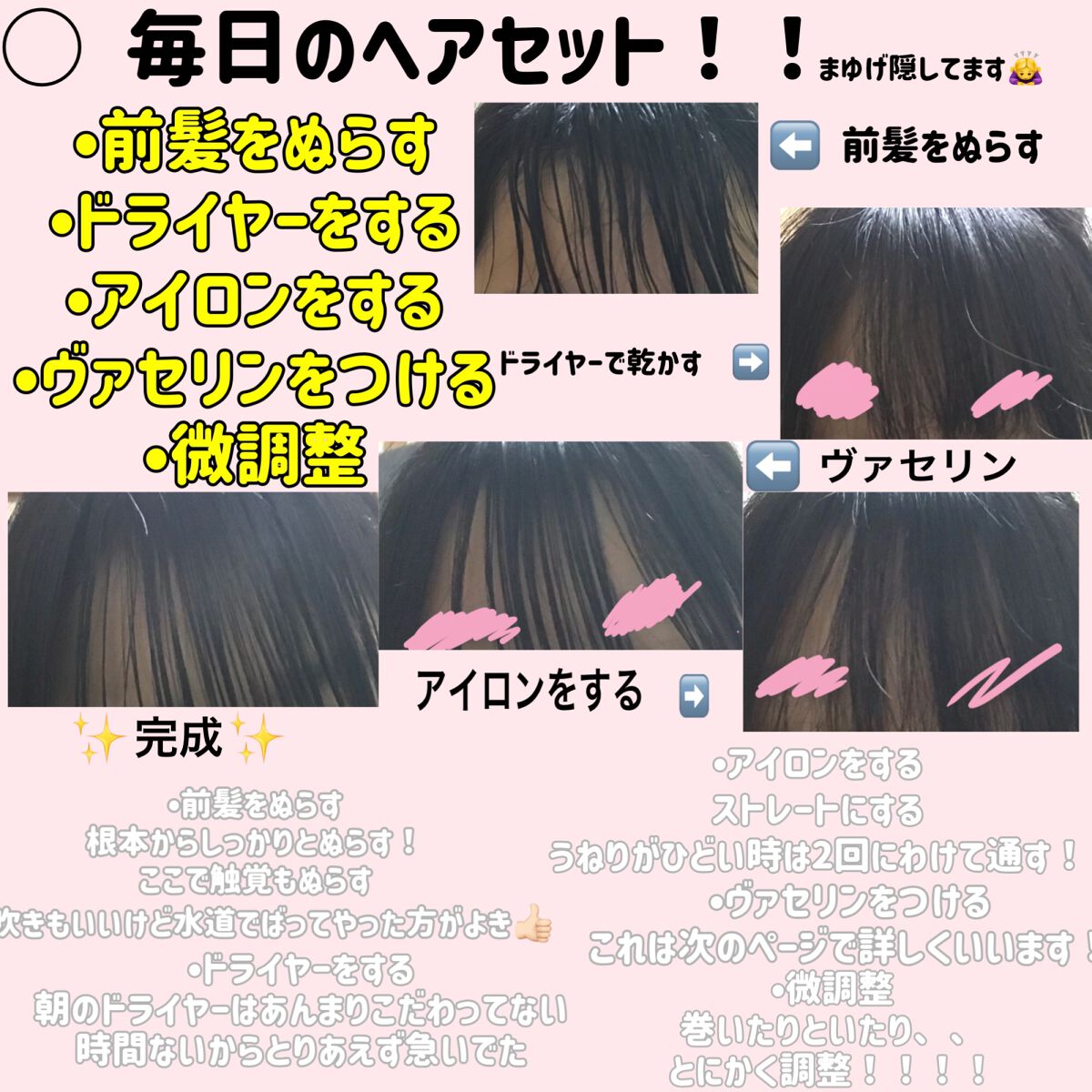 まず、前日のお風呂上がりに、あんず油を髪全体につけているのですが、後ろの髪に塗って、余ったものを前髪にもつけています! 朝起きたら、ドライヤーで前髪の癖をとります なるべく小さめのヘアアイロンで、毛先を中心に巻きます! くしで整えたら、紫のケープをつけます。まず、根元だけに3~4プッシュ、毛先から根元全体にかかるように、左か右から、順番に5~6プッシュ、最後に指にケープをつけて、毛先だけにつけます!これは8回くらいやります💭 そして、マスクは鼻にピッタリフィットさせることが大事です!そこの間が空いてると、水蒸気が漏れて、前髪が崩れていまいますᵒ̴̶̷̥́ーᵒ̴̶̷̣̥̀