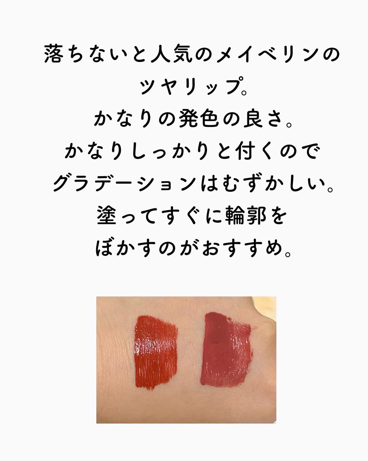 - メイベリン人気No.1リップ からツヤタイプついに誕生!*1 シャカシャカ振って!#落ちないリップ*2 色・ツヤ・仕上がり、全てロック。 〈製品特徴〉 ①シャカシャカ振って、長持ち効果! 膜形成成分*3と高濃度ピグメント*4の2層構造。 シャカシャカ振ると膜形成成分*3と高濃度ピグメント*4が混ざり、 色、ツヤ、仕上がりの長持ち効果! ②色もツヤも落ちない! 最長16時間続く、#落ちないリップ*2 メイベリン独自のトリプルロックフォーミュラ。色・ツヤ・仕上がり、全てロック。 食べても、飲んでも、塗りたての仕上がりが落とすまで続く。*2 ③濃密な発色とツヤをひと塗りで。 塗った瞬間、ムラなく発色。 顔色まで明るくトーンアップするような仕上がりに。*5 ④唇を包み込み、うるおい感ある仕上がりに。 乾燥しにくく、一日中*6心地良い仕上がりに。 塗った瞬間、唇をふっくらとみせ、縦じわが目立ちにくい。 *1:インテージSRI+調べ。2018年9月~2022年7月までのスーパー、ドラッグストア等におけるメイベリン ニューヨーク リップカテゴリーでの売上金額に基づく。 *2:着用16時間を想定した最長の場合において。メイクアップリムーバーで落とすことが可能です。メイベリン ニューヨーク調べ。個人差があります。 *3:トリメチルシロキシケイ酸、ポリプロピルシルセスキオキサン、アルキル(C30-45)ジメチルシリルポリプロピルシルセスキオキサン、ポリメチルシルセスキオキサン/トリメチルシロキシケイ酸。 *4:メイベリン従来品(ウォーター シャイニー ボリューミー パール)と比較において、3倍のピグメントを配合 *5:メイクアップ効果 *6:メイベリン ニューヨーク調べ。個人差があります。
