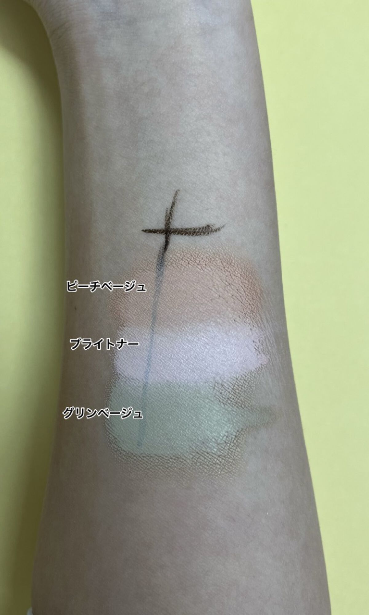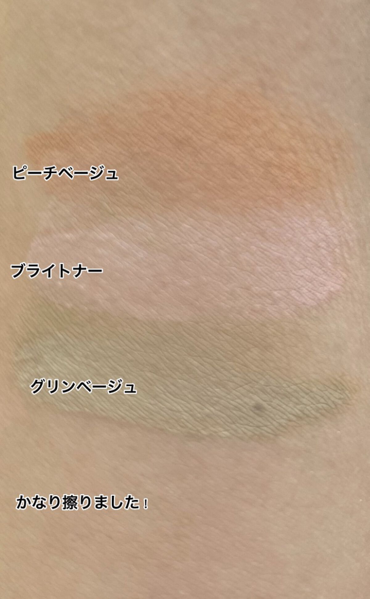 【崩れにくさ】全然崩れません。それが故に使うのが難しいのかも… 【良いところ】ものすごく綺麗にカバーされます!ただマットだからなのか毛穴が目立ちます。いい匂いがします!人によっては嫌いかも…柔らかい匂いです❀ 【イマイチなところ】液がとても緩く感じました。初心者の方にはセザンヌのコンシーラーパレットがおすすめ( ˆoˆ ) [ピーチベージュ]★★★★★ オススメです!涙袋にも!クマにも!涙袋に塗る時は小さいブラシに取ってから塗るのがオススメです!直接チップで塗るとベタ塗りしたように見えます。学校にはハイライトとして使ってもバレません!でも人によっては腫れぼったくなるかも… [グリーンベージュ]★★★★☆※写真ではグリンベージュになっています。すみません🙇♀️ 正しくはグリーンベージュです。ニキビが結構隠れます。でも治りたてのニキビに塗るとせっかく治りかけなのに悪化してしまいました…使う時は気をつけてくださいm(*_ _)m