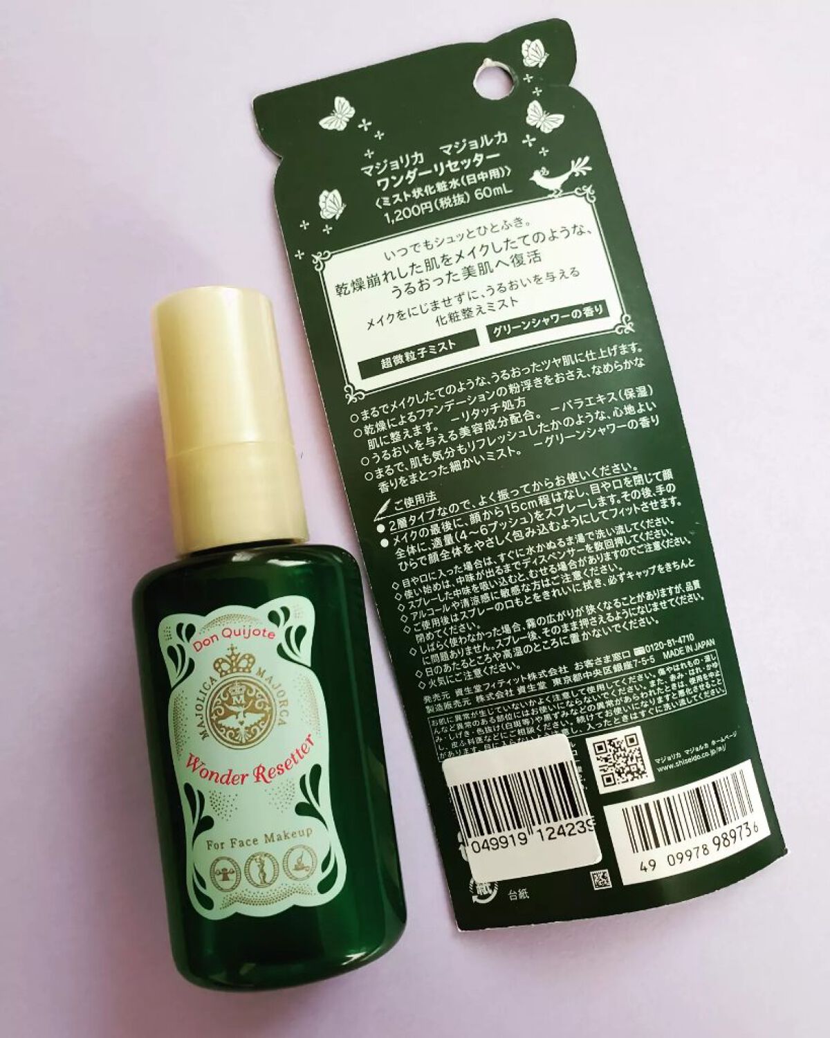 - ドン・キホーテ限定発売 いつでも、メイクしたて うるツヤ肌に復活 化粧整えミスト ○まるでメイクしたてのような、うるおったツヤ肌に仕上げます。 ○乾燥によるファンデーションの粉浮きをおさえ、なめらかな肌に整えます。 -リタッチ処方 ○うるおいを与える美容成分配合 -バラエキス(保湿) ○まるで、肌も気分もリフレッシュしたかのような、心地よい香りをまとった細かいミスト -グリーンシャワーの香り