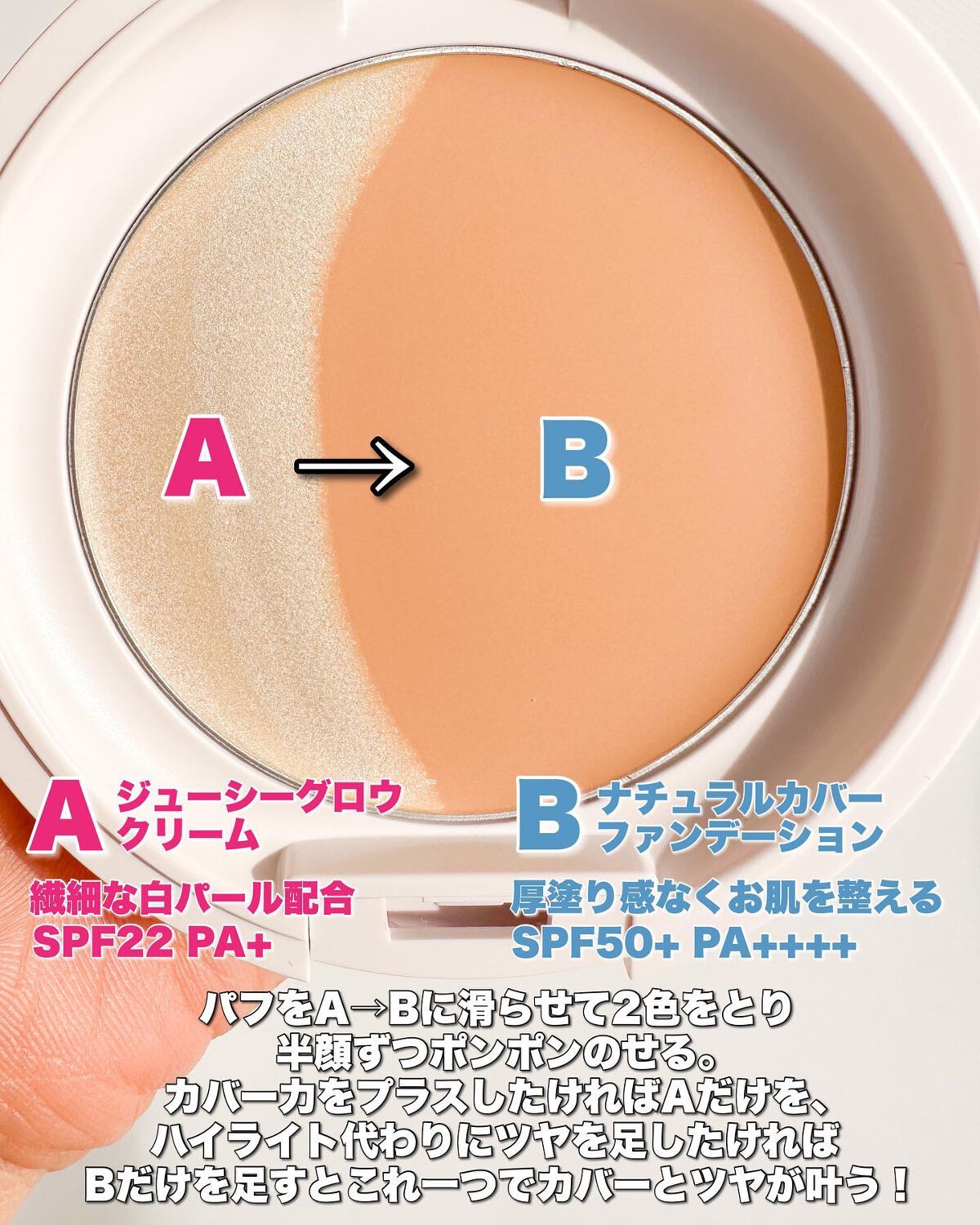 - ツヤとカバーの2種のベースが1つになった 2in1ツヤ肌パクト 繊細な白パールをたっぷり配合した上品なジューシーグロウクリームと パール無配合で肌悩みを自然にカバーするナチュラルカバーファンデーションの、2in1構造! ツヤを好きなだけ自由にのせて、自分好みのツヤ肌を叶えてください♡ 美容オイル配合で、まるでスキンケアしたてのようなちゅるちゅるお肌が続きます。