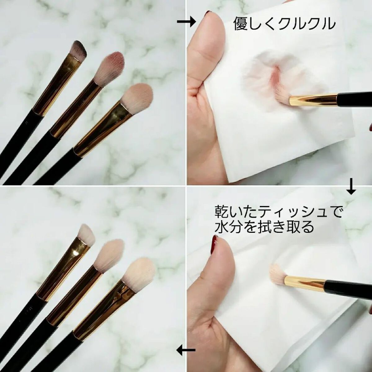 使用方法は簡単でティッシュやコットンに適量出して液が付いたところにブラシをくるくるさせると汚れがどんどん取れていきます! 完全に綺麗になるわけではないので定期的に水と洗剤で洗う必要はありますが週1回の簡単なお手入れとして使用しています! 手軽にできるので夜寝る前など気がついた時にくるくるさせて綺麗なブラシでメイクできればもっと気分も上がるかな!と思います!