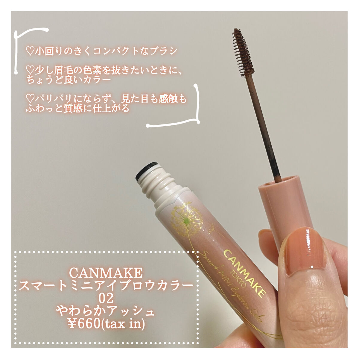 - ミニブラシでとにかく塗りやすい!! ふんわり仕上がる眉マスカラ 小回りの利くミニブラシがとっても塗りやすい眉マスカラ。 毛を1本1本逃さず、ナチュラルに染まります。 パリパリ感もなく、ふんわりとした自眉感のある仕上がりに! 地肌につきにくいのもうれしいポイント♡