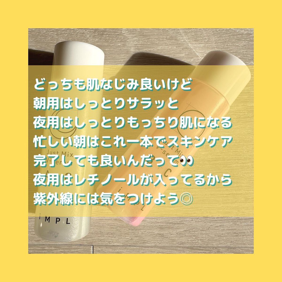 朝用美容液:iMPL Just Mix V-serum B+C 夜用美容液:iMPL Just Mix V-serum A+C ピンク色で、乾燥によるくすみが気になっている方におすすめ! さらっとした使い心地なので、その後のメイクに影響しにくいです♪ 黄色で肌のハリが気になる方におすすめ! 朝用よりもしっとりとしていますが、べたつかないので使い心地がとっても好みです♡ どちらもオイル少な目でさらっとしていて、忙しい朝・夜はこれ一本でお手入れ完了もOKです! メーカーはゾンネボード製薬さんだそうです😆🧡