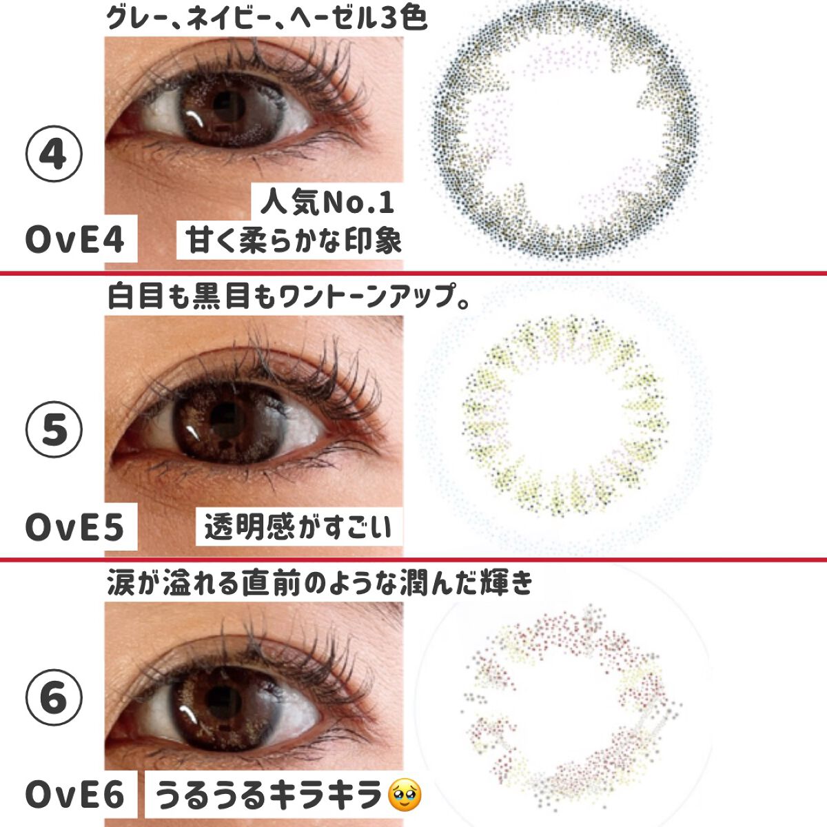 🏷️OvEOvE選べる6種お試しセットOvE1OvE2OvE3OvE7OvE8OvE9✄✄業界初のレンズデザインでグッドデザイン賞受賞した、ヘアメイクアップアーティスト中野明海さん監修✨✨瞳に映る光をデザインしたカラコンとは違う新発想のキャッ...