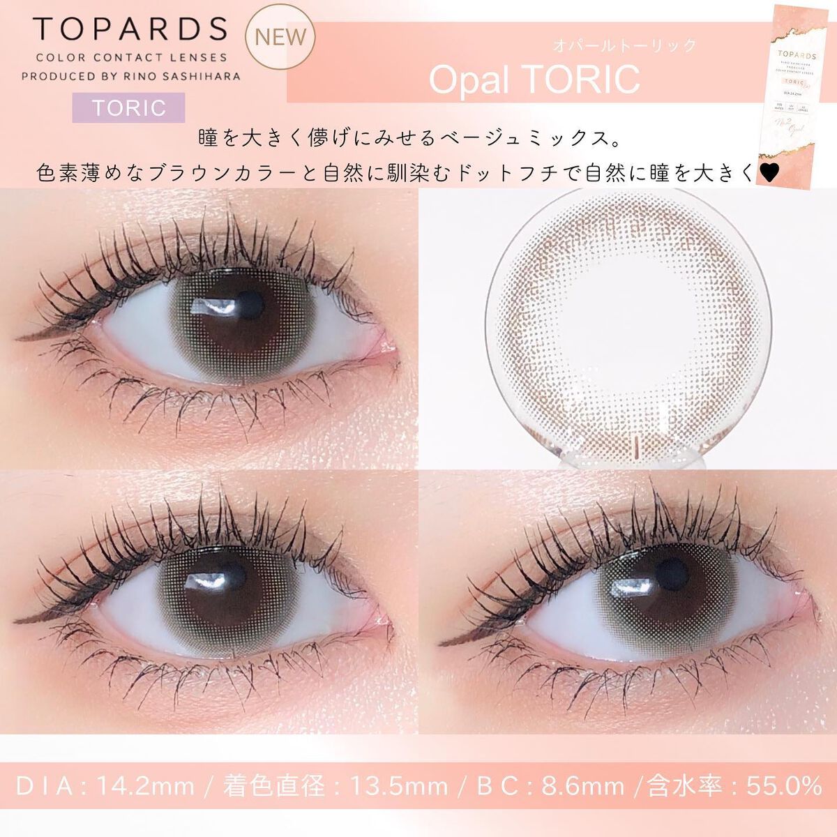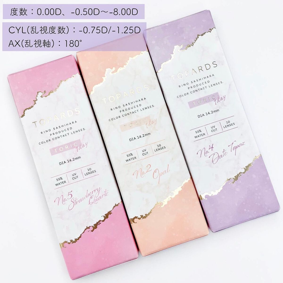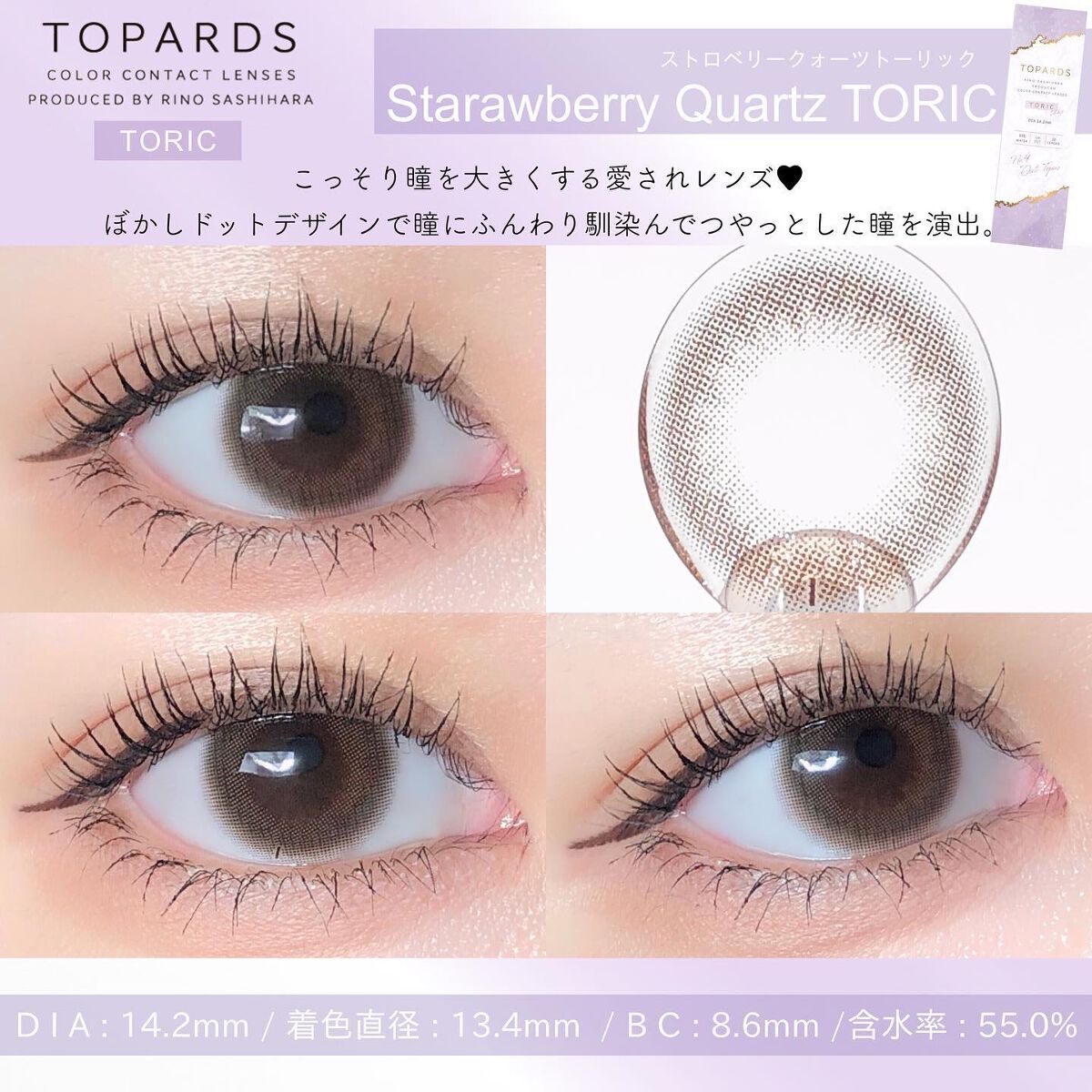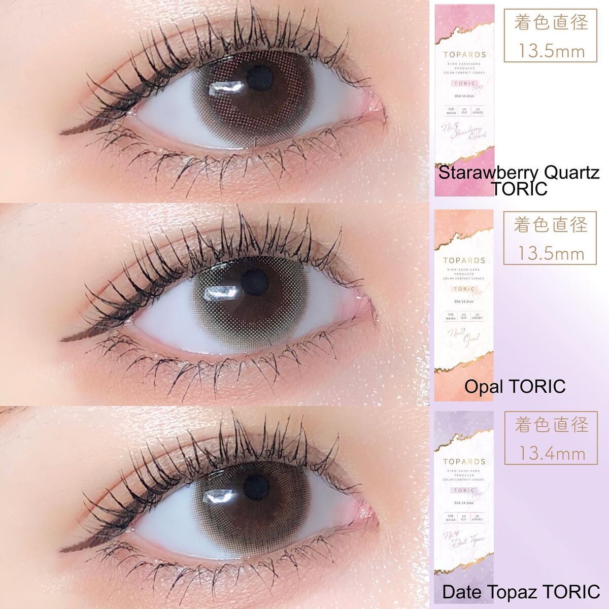 - ※2025年6月以降、商品パッケージ裏面・側面の一部表記を順次変更いたします。尚、これにかかる商品の交換・返品は承っておりません。 ぼかしドットデザインが瞳にふんわり馴染み、自然につやっとした瞳を演出できる乱視用カラーコンタクトです。 ■Strawberry Quartz TORIC(ストロベリークォーツ トーリック) ブラウンカラーにピンクをほんのりプラス。着けることで一気に甘い顔になれるレンズ。 ■Opal TORIC(オパール トーリック) 瞳を大きくはかなげな印象にみせる、ベージュミックスの色素薄めブラウンカラー。 ■Date Topaz TORIC(デートトパーズ トーリック) デート専用レンズ。着けてるとバレずにこっそり可愛いが仕込めるふんわりデザイン。 カラーコンタクトレンズの不適正使用による眼障害の危険性等などがあります。 ●コンタクトレンズは高度管理医療機器です。不十分な洗浄・消毒など不適切なケアや、長時間・交換期間を超えた装用により、アレルギー性結膜炎、角膜感染症、角膜潰瘍等の重篤な眼障害が発生する危険性があります ●ご使用前に取扱説明書を確認してください 使用上の留意事項 ●眼科医院等を受診してからお求めください ●眼に異常を感じたら直ちにレンズ使用を中止し、お近くの眼科等で診察を受けてください ●医師の指示にしたがってご使用ください ●コンタクトレンズを装用する場合、自覚症状がなくても、眼科医院等での定期検査を受けてください ●レンズに不具合がある場合は使用しないでください