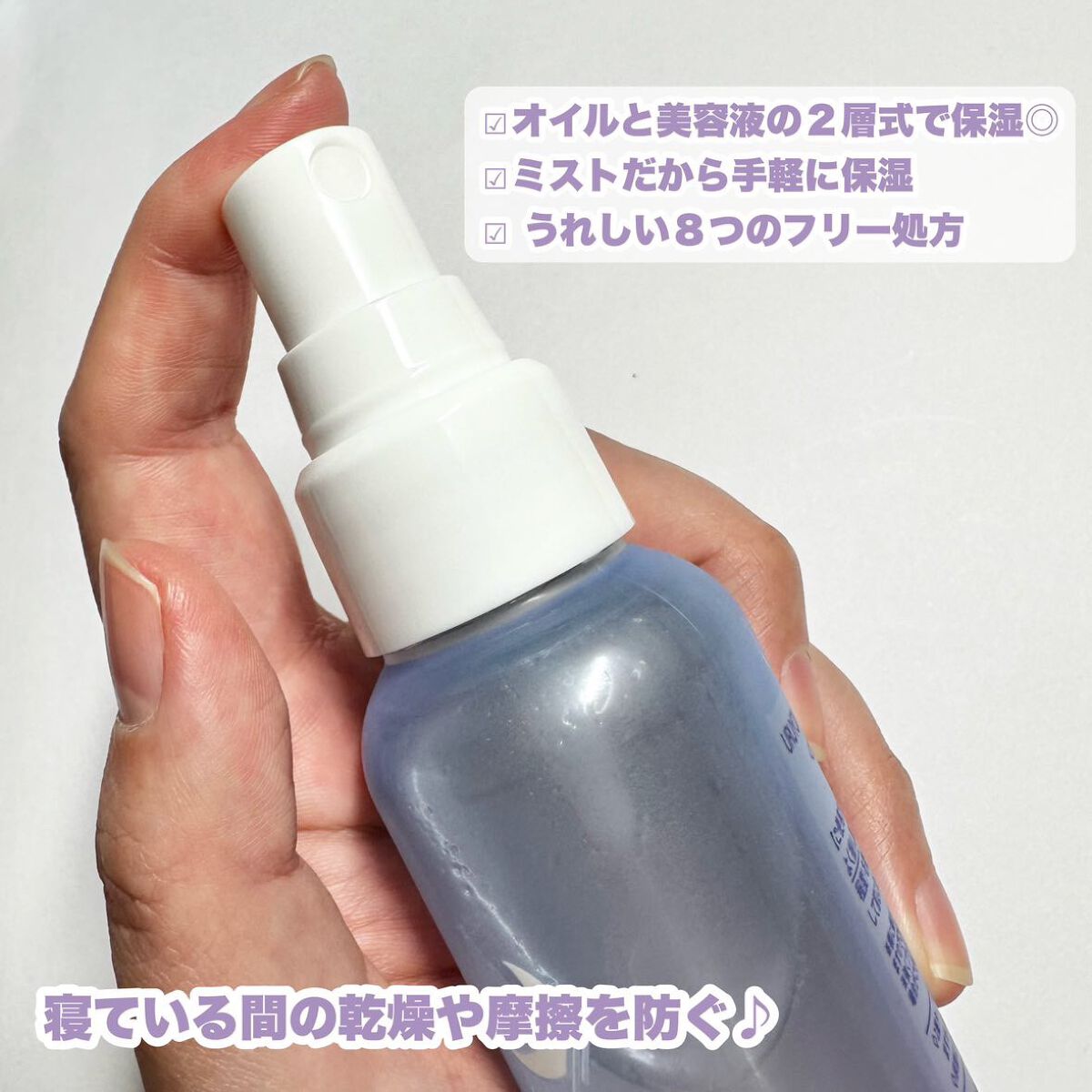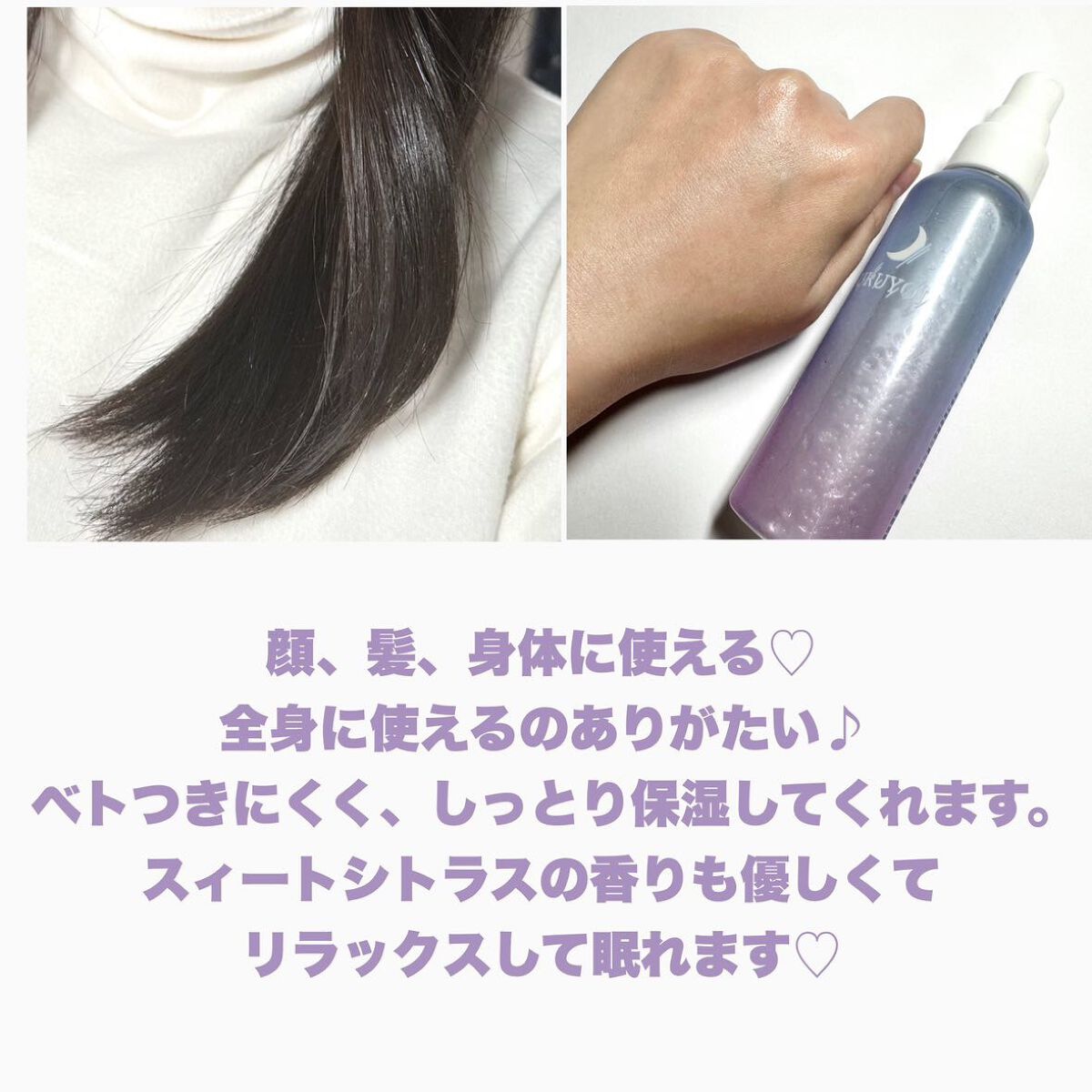 2層式のオイル&美容液ミストで、振って混ぜて使います。 モイストはスウィートシトラスの香り バランスはフォレストシトラスの香り 肌の状態に合わせて選べる2タイプ。 カサカサしてごわつくお肌にモイスト。 ベタつくのにカサつくお肌にバランス。 乾燥、摩擦など睡眠中の肌ストレスから保護し、翌朝つややかな素肌に導きます。 URUYOIつけたら寝るというルーティンができるのでおすすめです。 モイストのスウィートシトラスの香りが特に好きです。 さらに、バランスのフォレストシトラスの香りを追加するとまた違った香りになるので、組み合わせても良い香りがします。 顔、ボディ、そしてヘアにも使えるので、好きな部分に付けられるのも良いです。