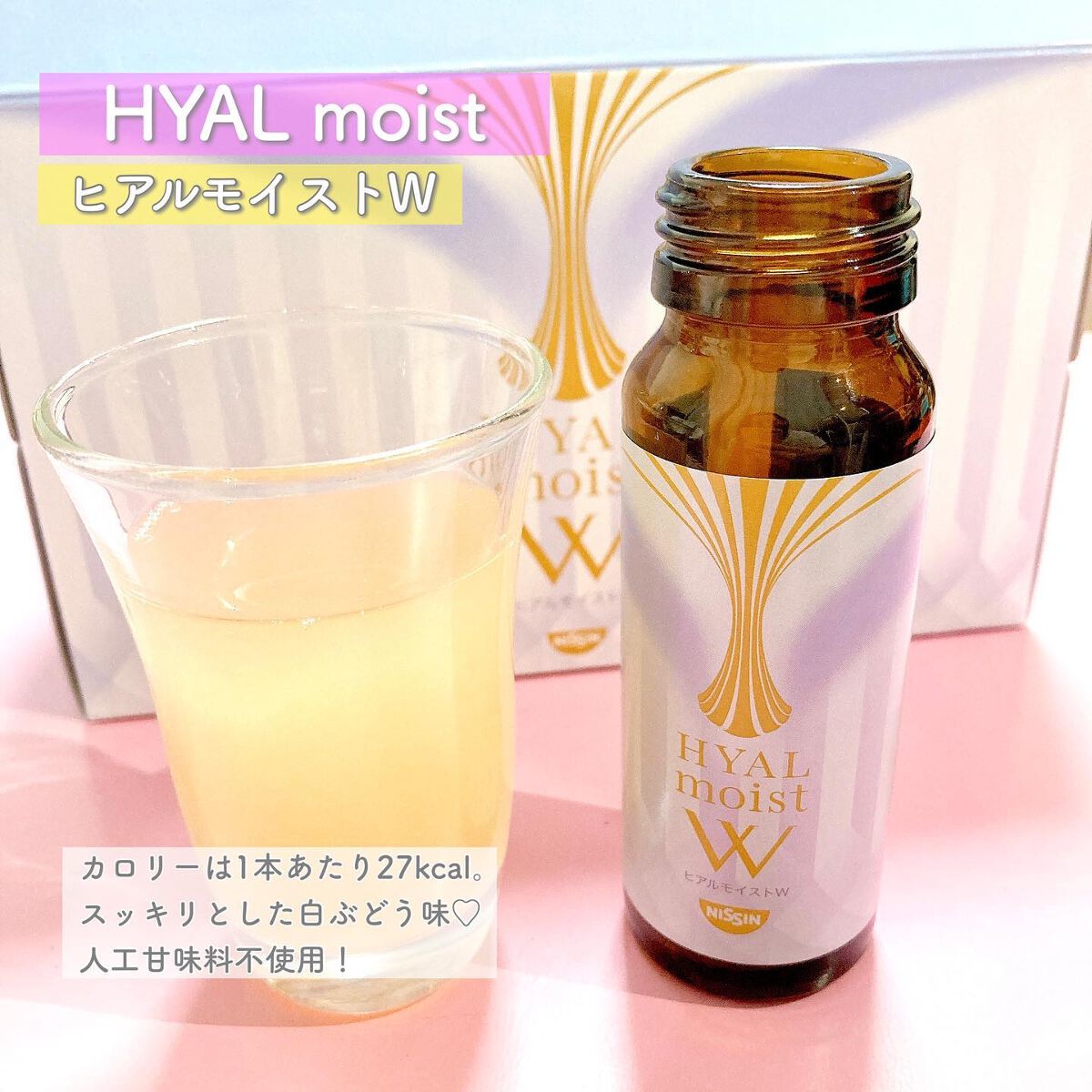 うるおいのある毎日を目指す美容ドリンク「ヒアルモイストW」♡ インナーケアを日々の習慣にしたい方におすすめ! 特許取得の乳酸菌を配合!日清食品独自の「ヒアルモイスト乳酸菌」配合美容ドリンク。 カロリーオフで白ぶどう味で飲みやすく、1本あたりたったの27kcal!