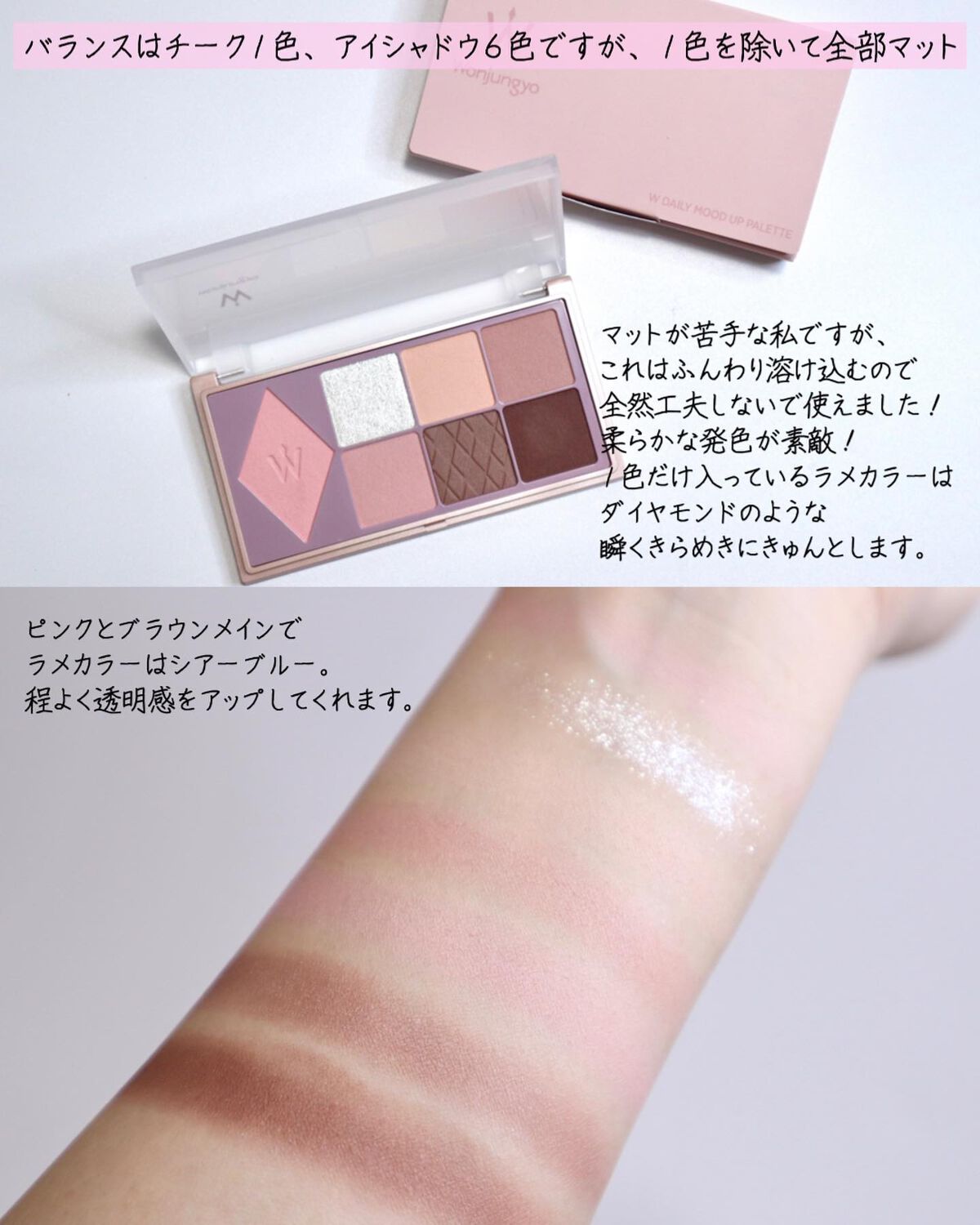 ずっと欲しかったWonjungyoのウォンジョンヨ W デイリームードアップパレット7月15日に購入♡ どのカラーも発色が綺麗✨️ マット、グリッター、シマーと3つの質感のシャドウが入ってて この淡さは嬉しかった❤️