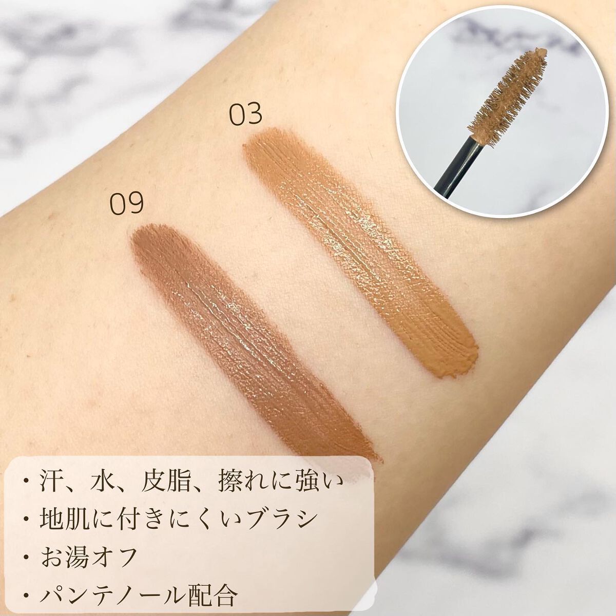 - 瞬時に『ナチュ眉』 ヘアに合わせて明るくチェンジ! ■ひと塗りでしっかり発色 眉毛の黒色をしっかりカバーし、きれいに発色します。 一度塗りでもしっかりと色が付き、重ねて塗るとさらに発色が良くなります。 ■地肌に付きにくく、簡単に塗ることができる、テクニカルブラシ採用 地肌につきにくいコンパクトサイズのテクニカルブラシを採用しています。 ムラになりにくく、誰でも簡単に塗ることができます。 ■どんな髪色にも対応できるカラーバリエーション 眉色を髪色に合わせたり、色味をおさえて明るくするだけで、自然でふんわりとした雰囲気に仕上がります。さらに、アイメイクを引き立て目を大きく見せます。 ■長時間落ちにくいのに、お湯で簡単オフ 汗・水・皮脂・こすれに強く、長時間落ちにくい処方です。 フィルムタイプなので、ぬるま湯でスルッと簡単に落とせます。 ■パンテノール(眉毛保護成分)配合 水溶性のビタミンで、肌に潤いと弾力を与えます。眉毛にツヤ・ハリを与えます。